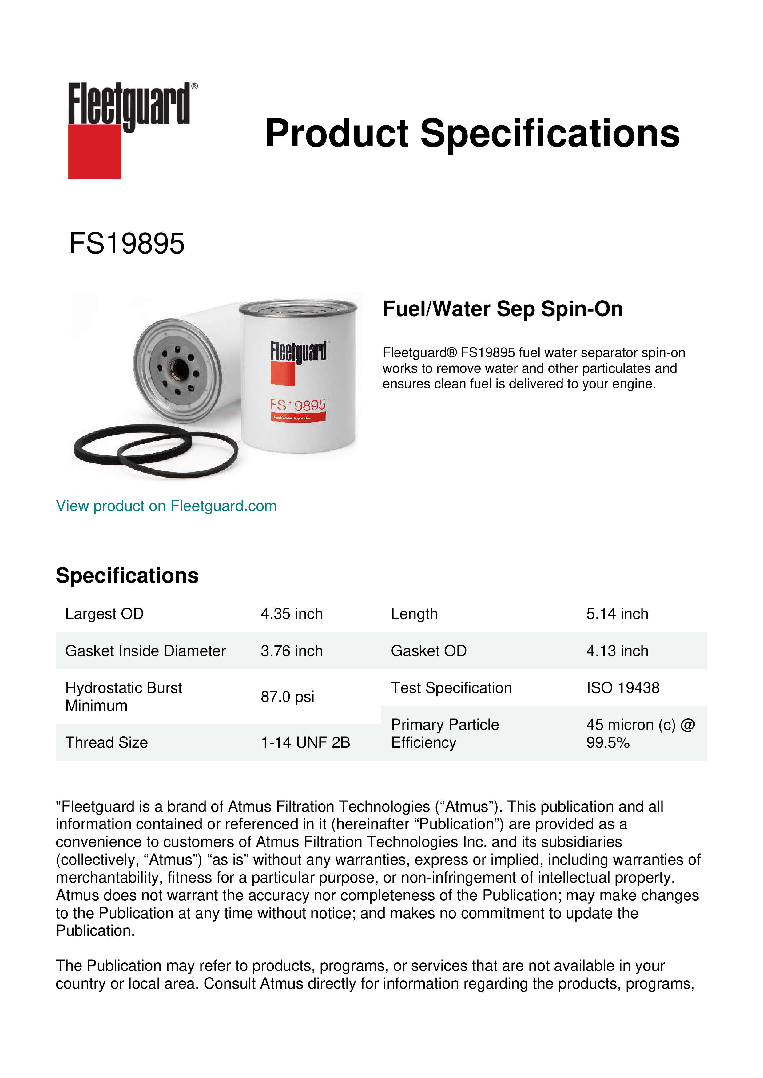 Fleetguard® FS19895 fuel water separator spin-on works to remove water and other particulates and ensures clean fuel is delivered to your engine.Specification
