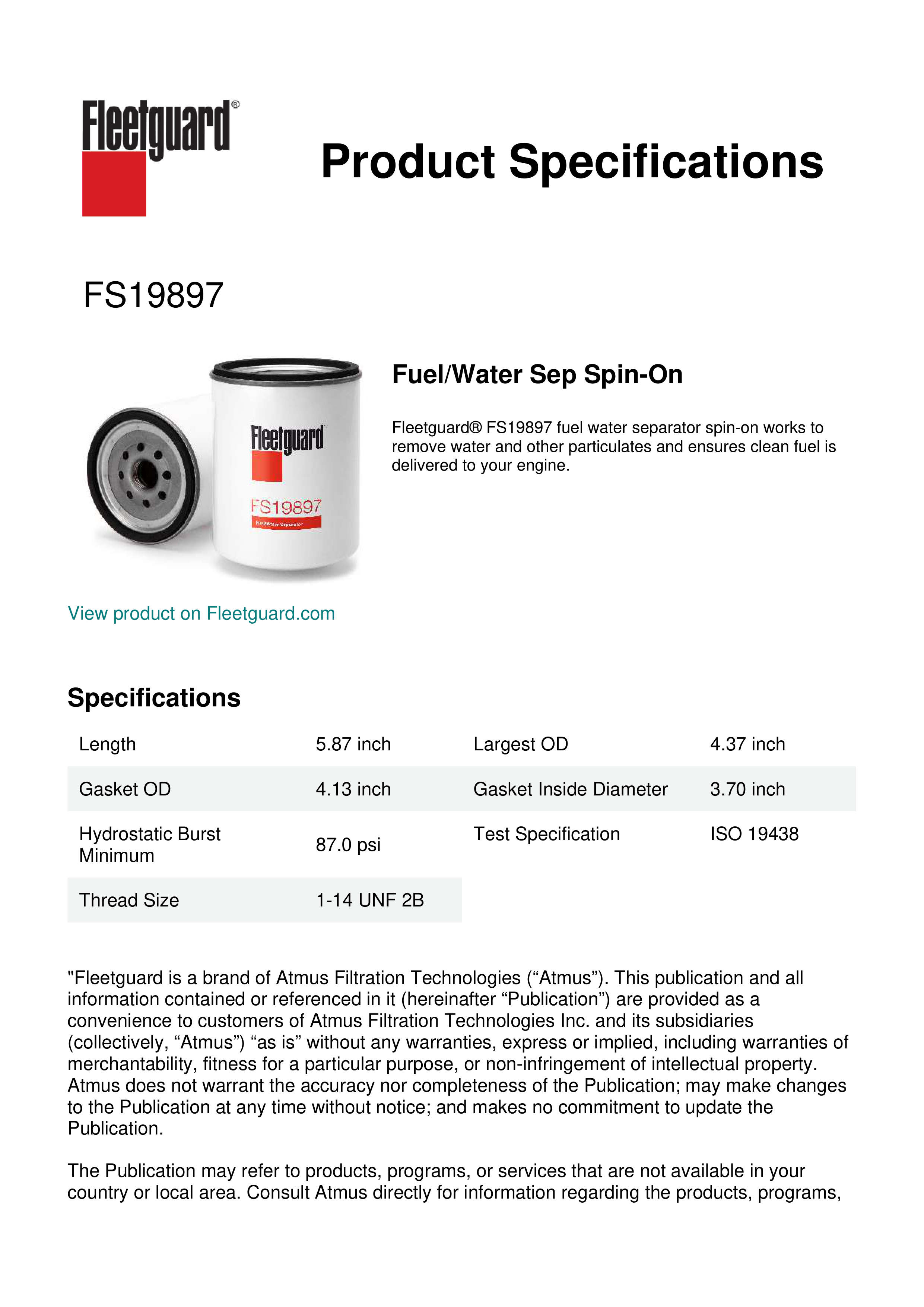 Fleetguard® FS19897 fuel water separator spin-on works to remove water and other particulates and ensures clean fuel is delivered to your engine.Specification