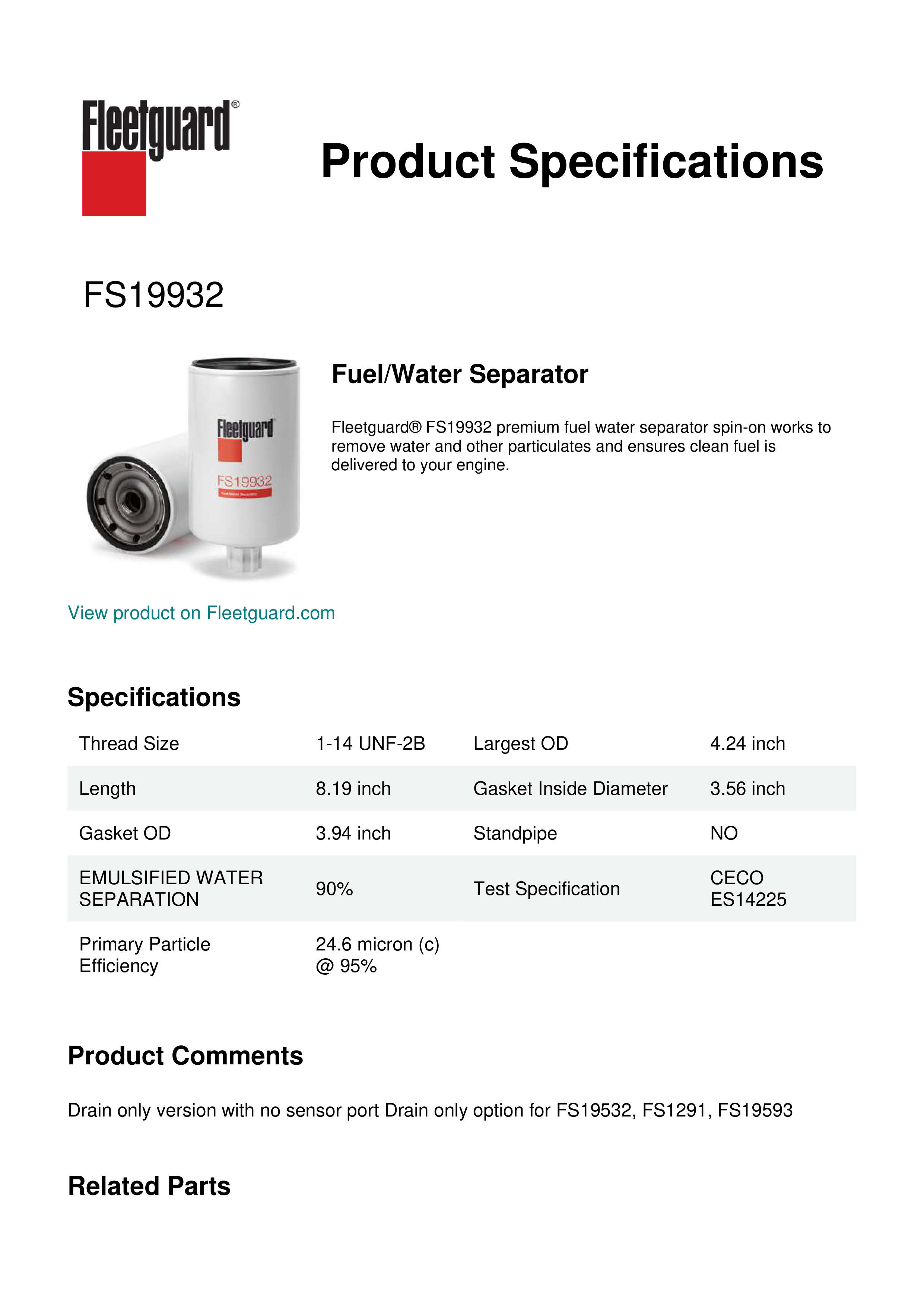 Fleetguard® FS19932 premium fuel water separator spin-on works to remove water and other particulates and ensures clean fuel is delivered to your engine.Specification