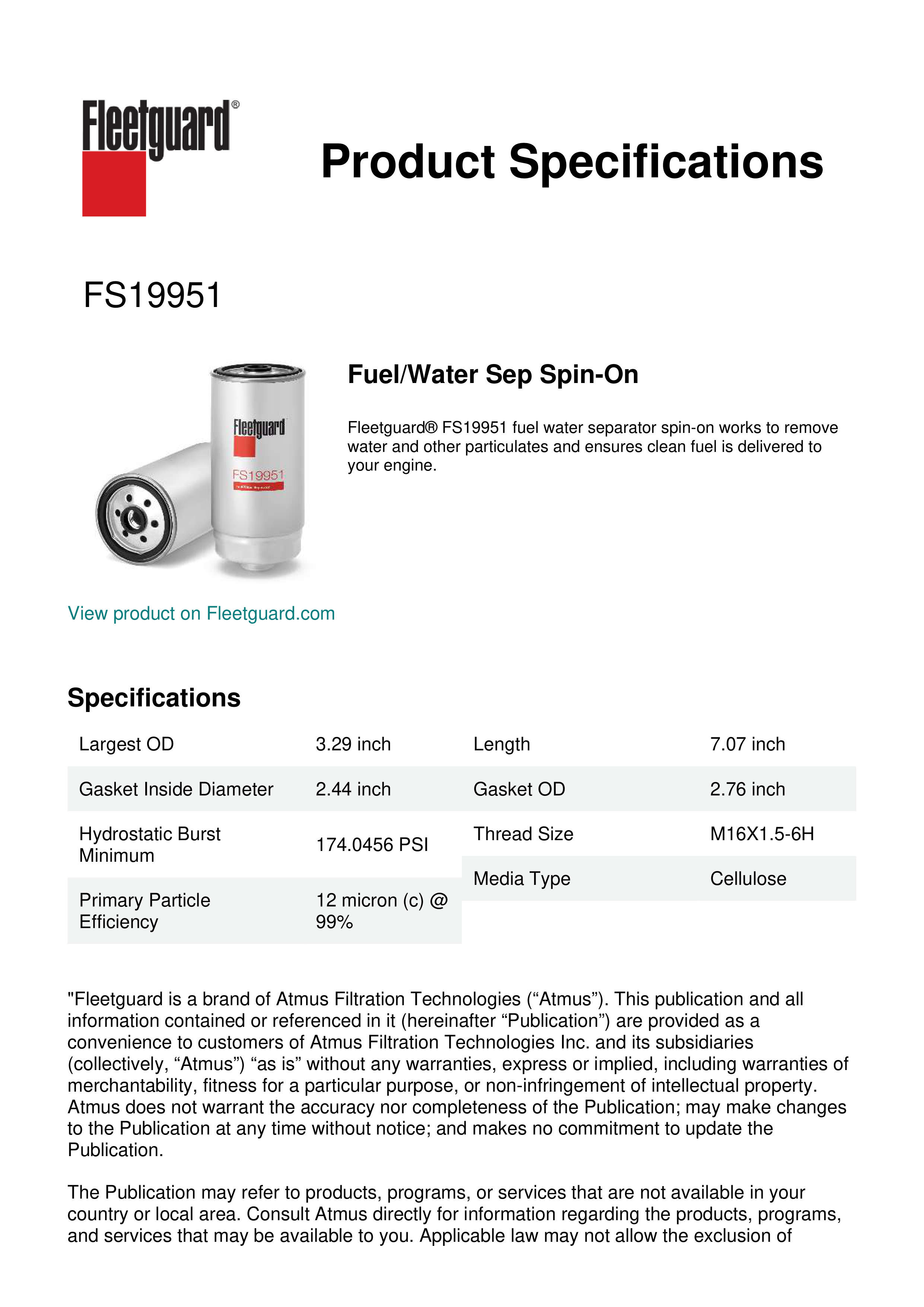 Fleetguard® FS19951 fuel water separator spin-on works to remove water and other particulates and ensures clean fuel is delivered to your engine.Specification