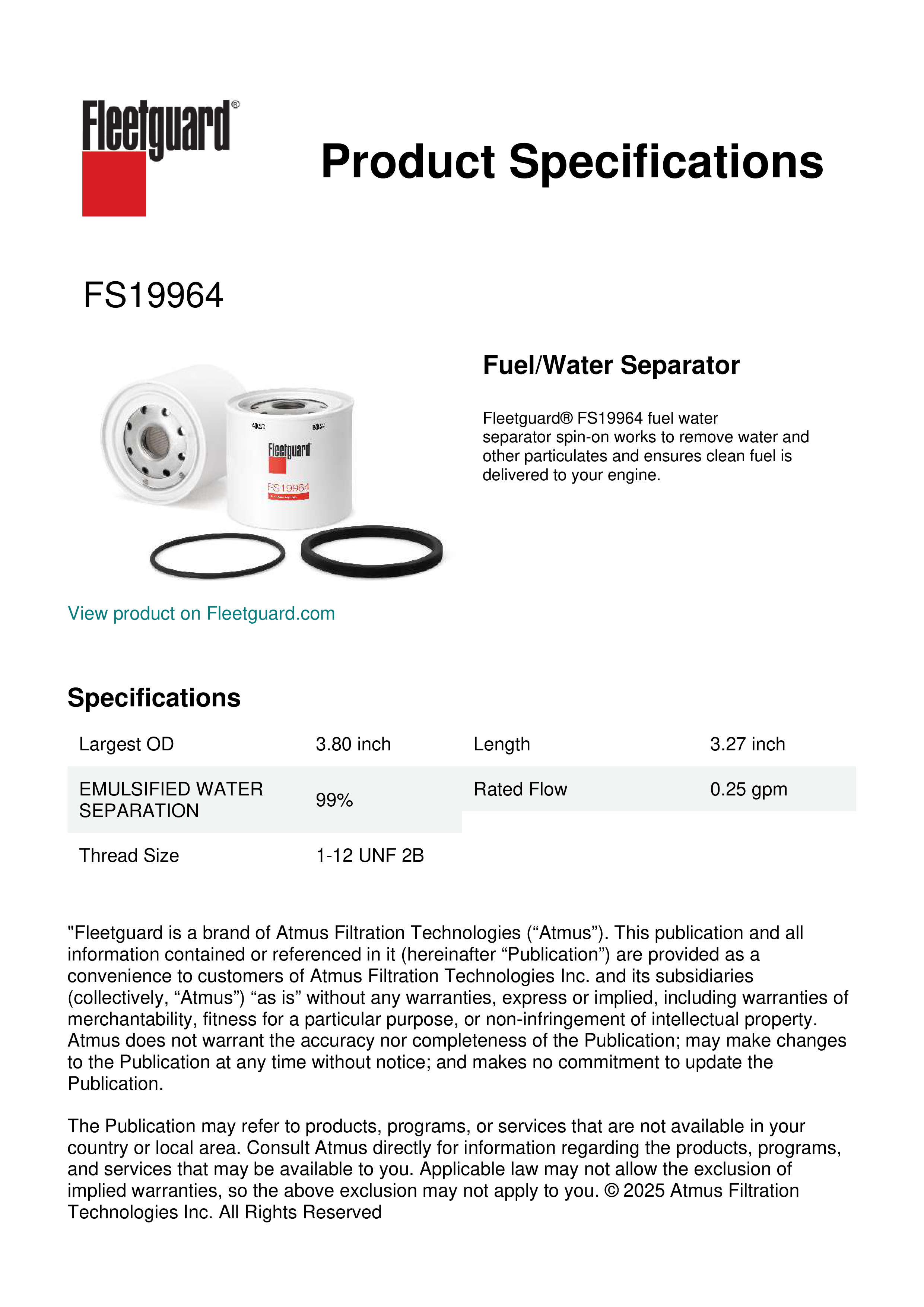 Fleetguard® FS19964 fuel water separator spin-on works to remove water and other particulates and ensures clean fuel is delivered to your engine.Specification