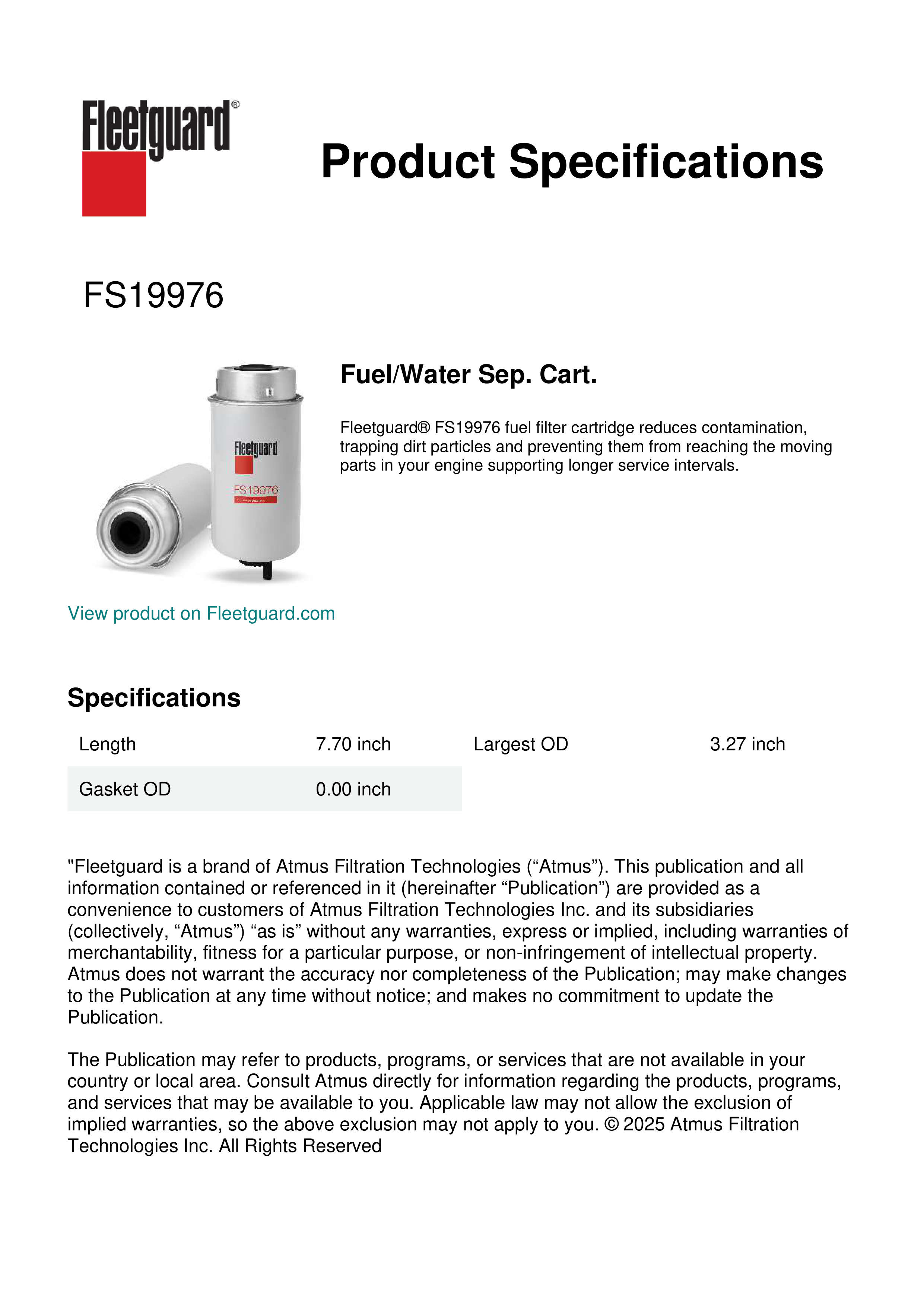 Fleetguard® FS19976 fuel filter cartridge reduces contamination, trapping dirt particles and preventing them from reaching the moving parts in your engine supporting longer service intervals.Specification