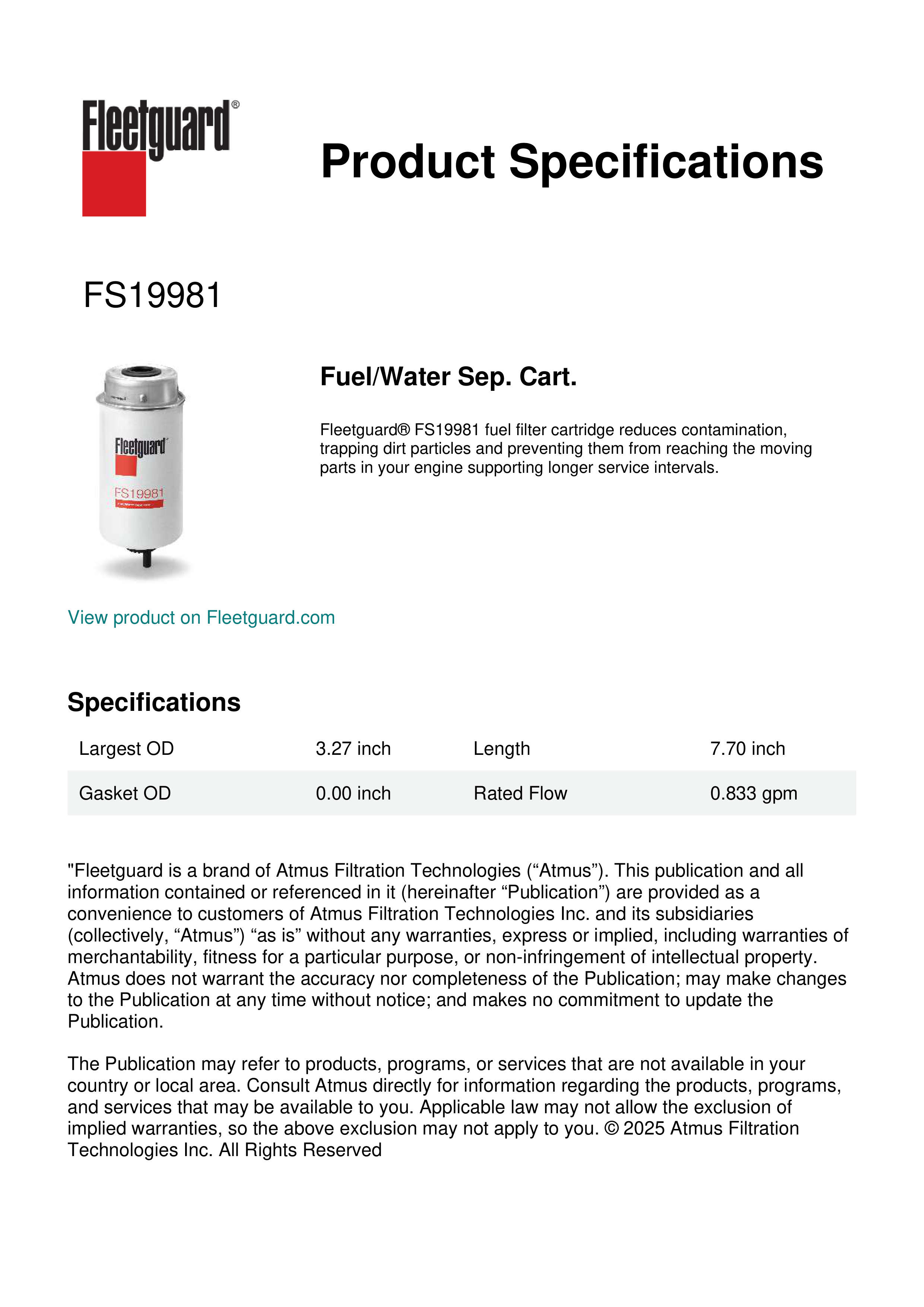 Fleetguard® FS19981 fuel filter cartridge reduces contamination, trapping dirt particles and preventing them from reaching the moving parts in your engine supporting longer service intervals.Specification