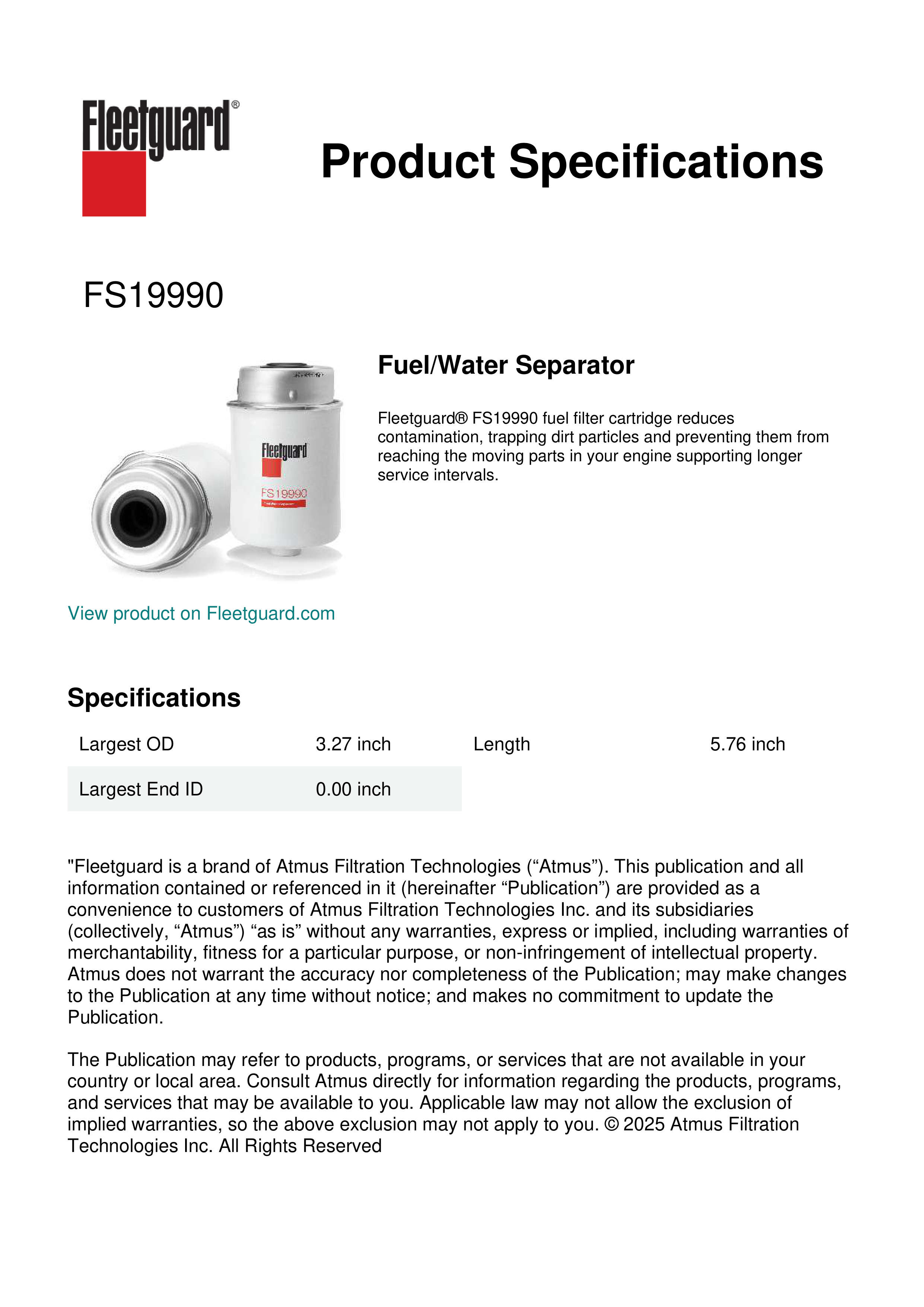 Fleetguard® FS19990 fuel filter cartridge reduces contamination, trapping dirt particles and preventing them from reaching the moving parts in your engine supporting longer service intervals.Specification