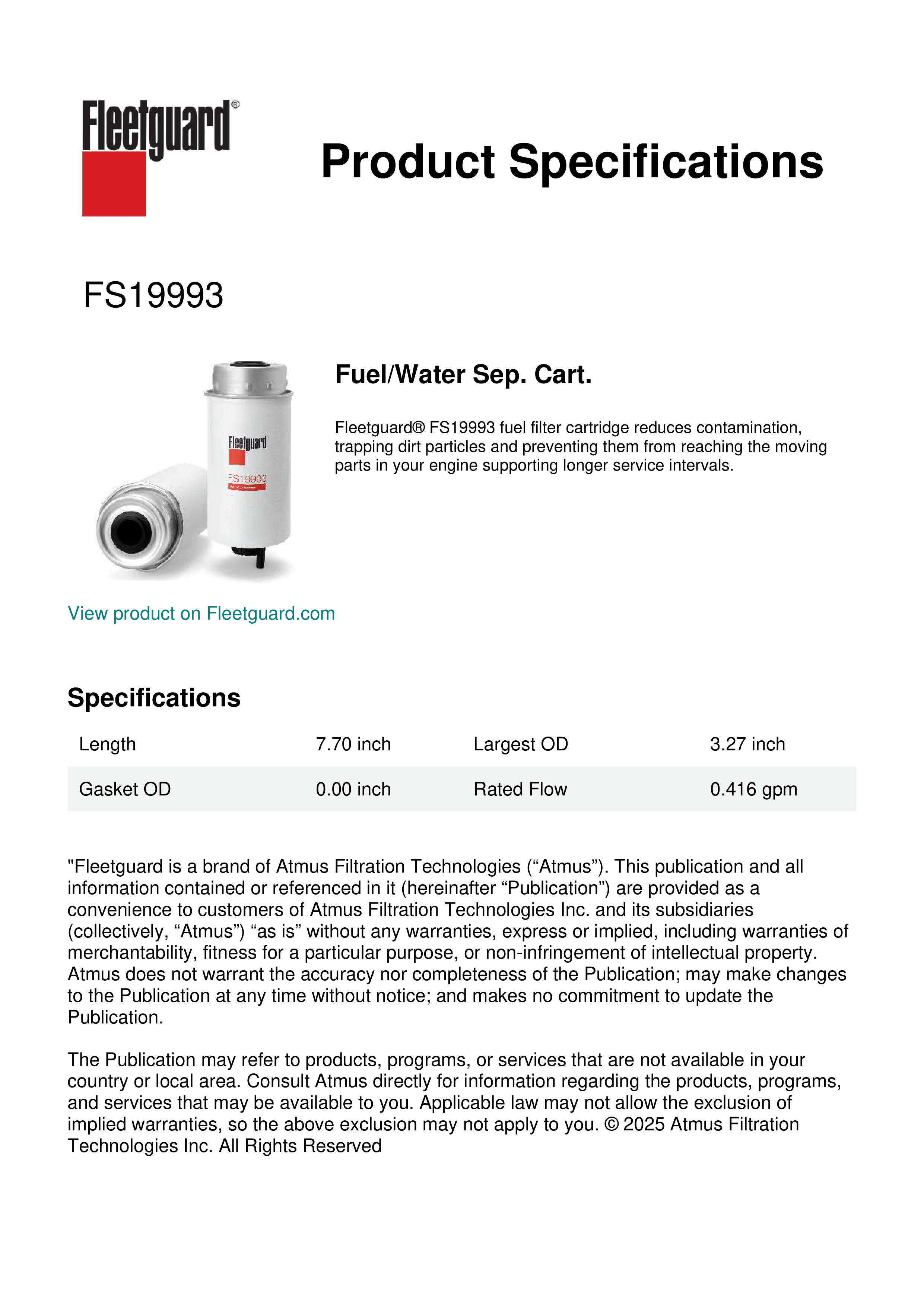 Fleetguard® FS19993 fuel filter cartridge reduces contamination, trapping dirt particles and preventing them from reaching the moving parts in your engine supporting longer service intervals.Specification