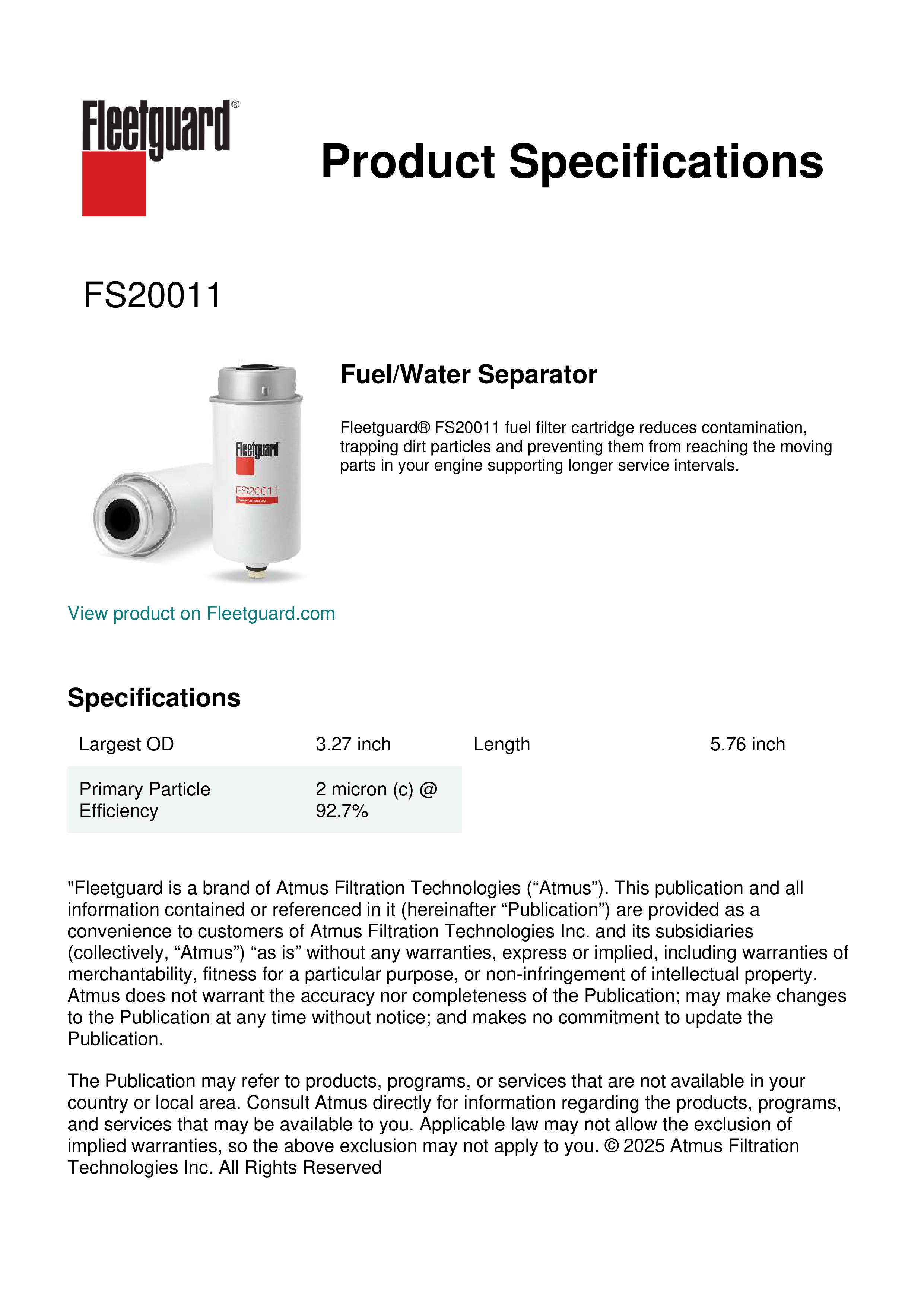 Fleetguard® FS20011 fuel filter cartridge reduces contamination, trapping dirt particles and preventing them from reaching the moving parts in your engine supporting longer service intervals.Specification