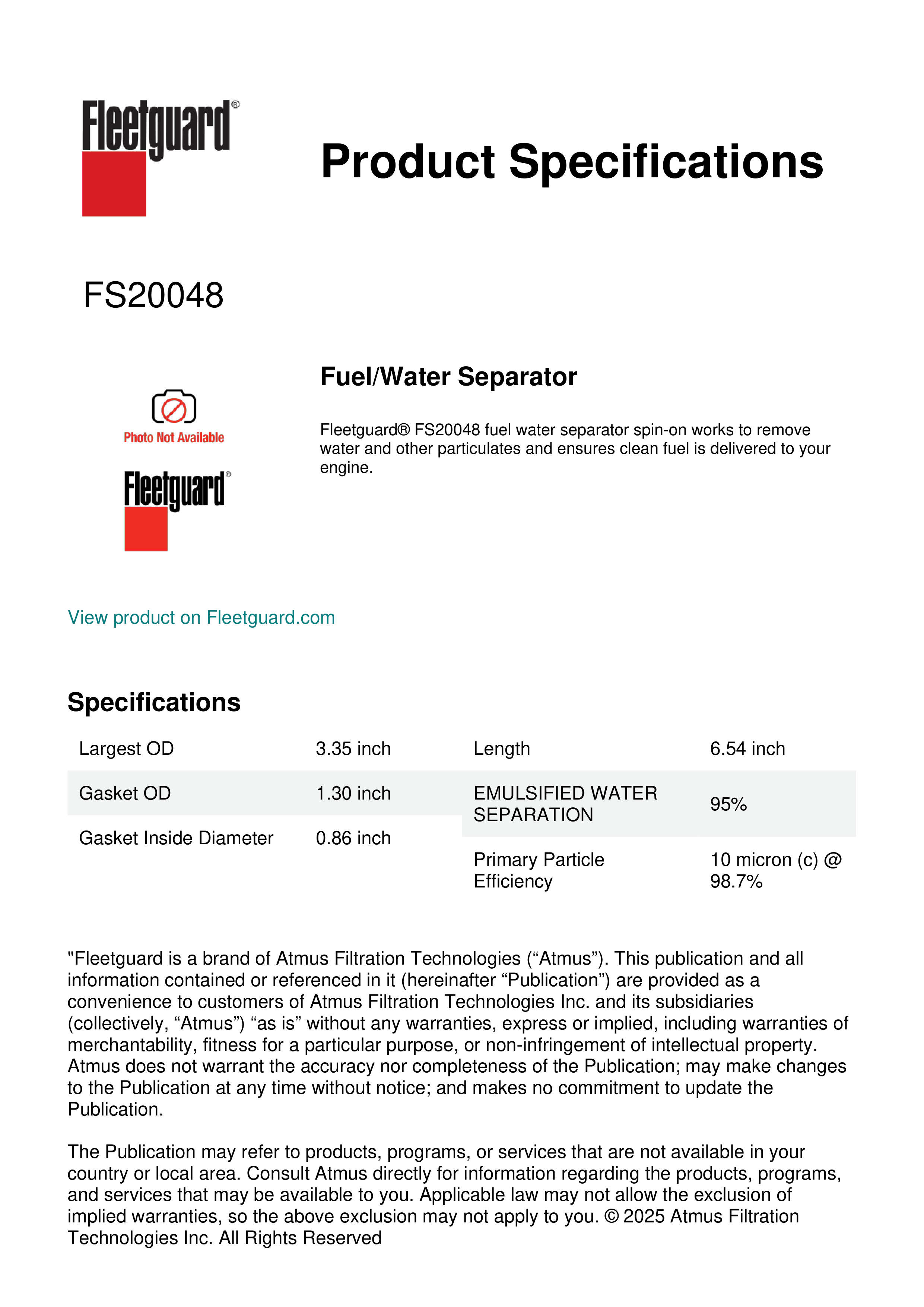 Fleetguard® FS20048 fuel water separator spin-on works to remove water and other particulates and ensures clean fuel is delivered to your engine.Specification