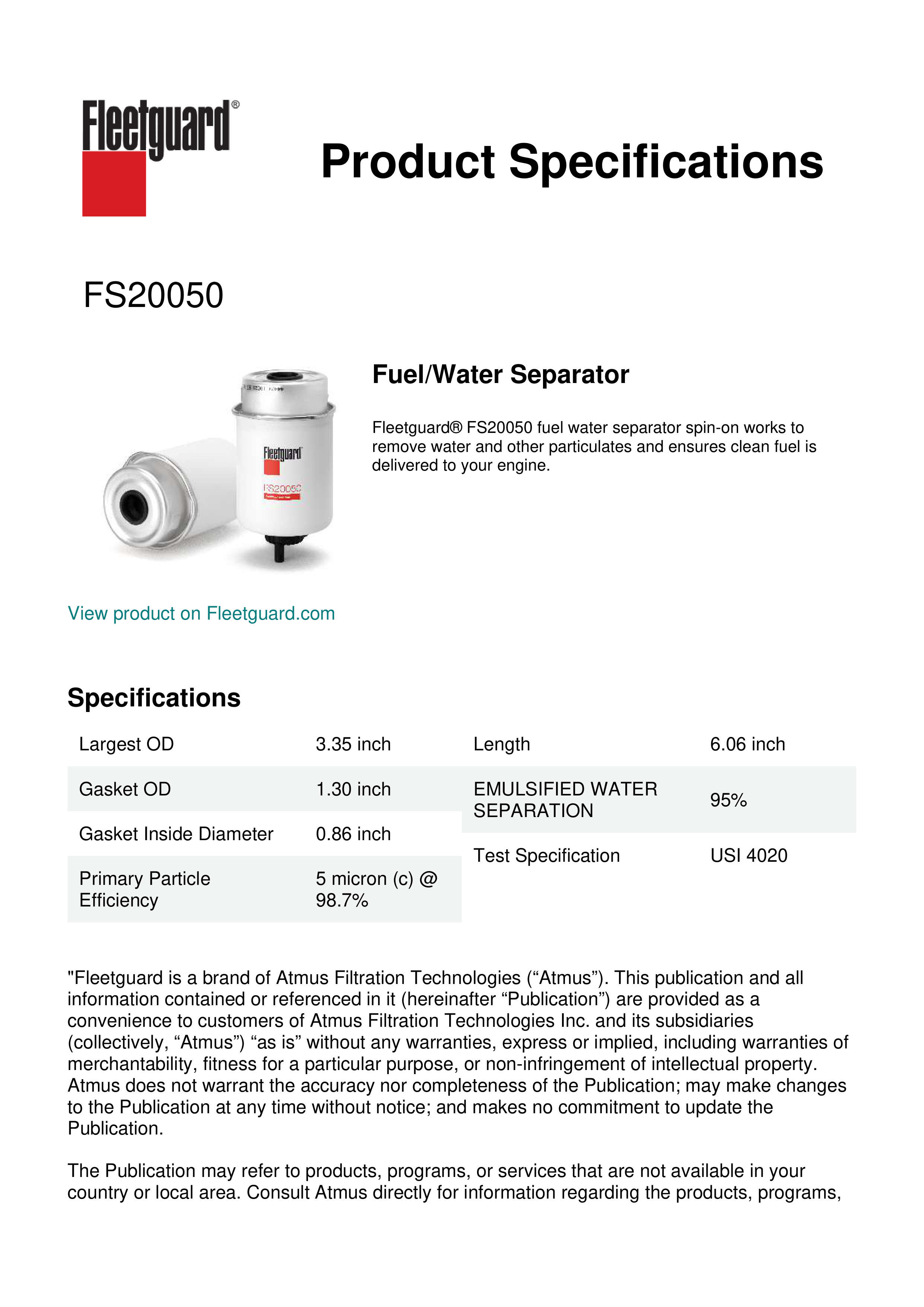 Fleetguard® FS20050 fuel water separator spin-on works to remove water and other particulates and ensures clean fuel is delivered to your engine.Specification