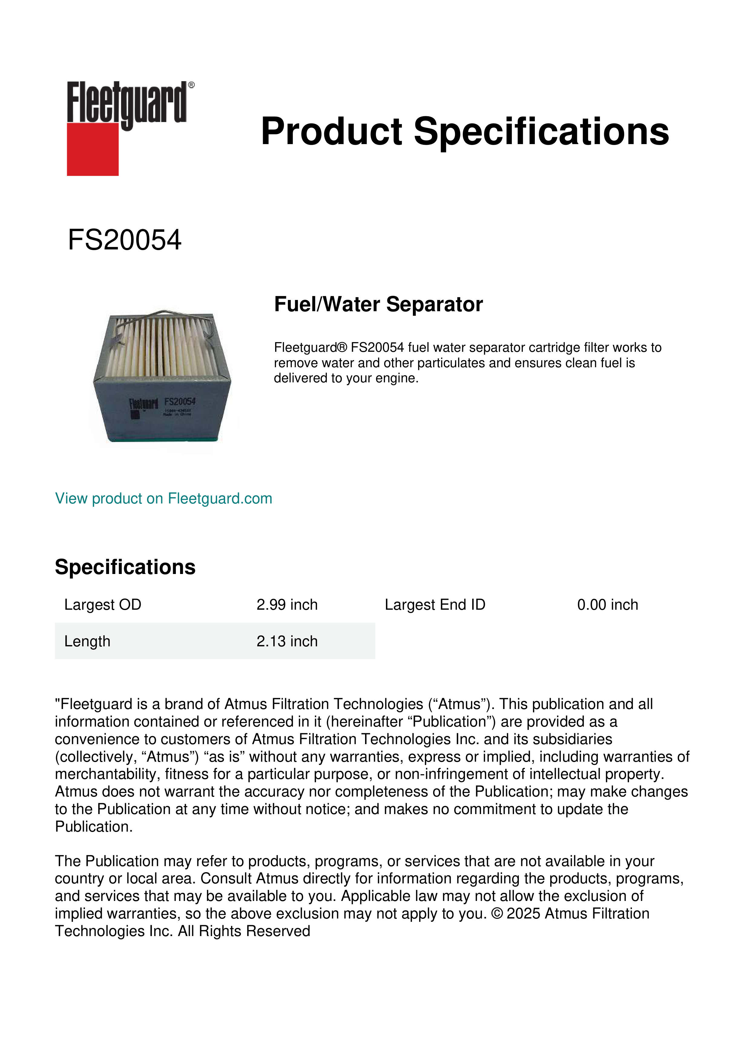 Fleetguard® FS20054 fuel water separator cartridge filter works to remove water and other particulates and ensures clean fuel is delivered to your engine.Specification