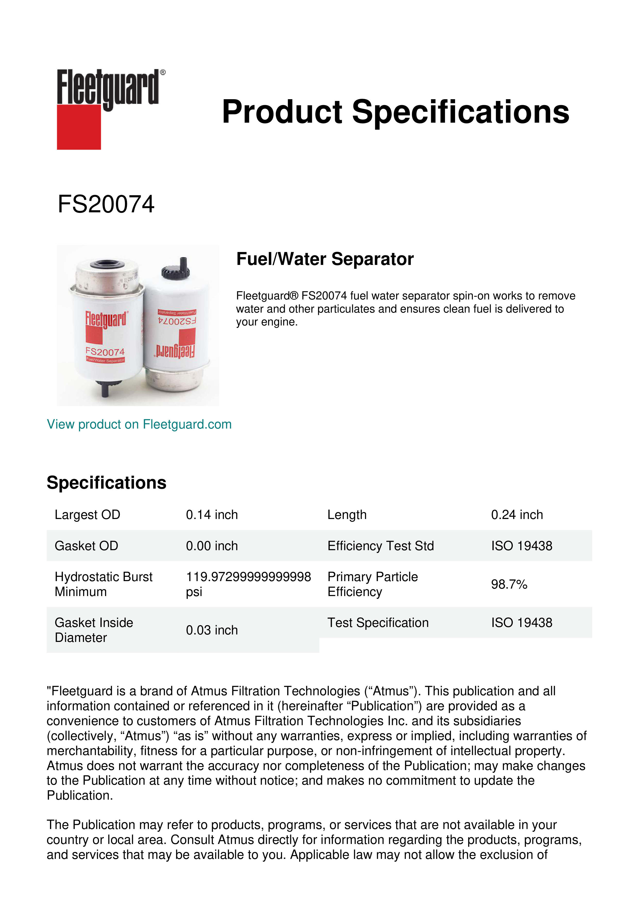 Fleetguard® FS20074 fuel water separator spin-on works to remove water and other particulates and ensures clean fuel is delivered to your engine.Specification