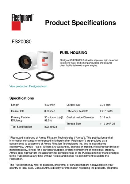 Fleetguard® FS20080 fuel water separator spin-on works to remove water and other particulates and ensures clean fuel is delivered to your engine.Specification