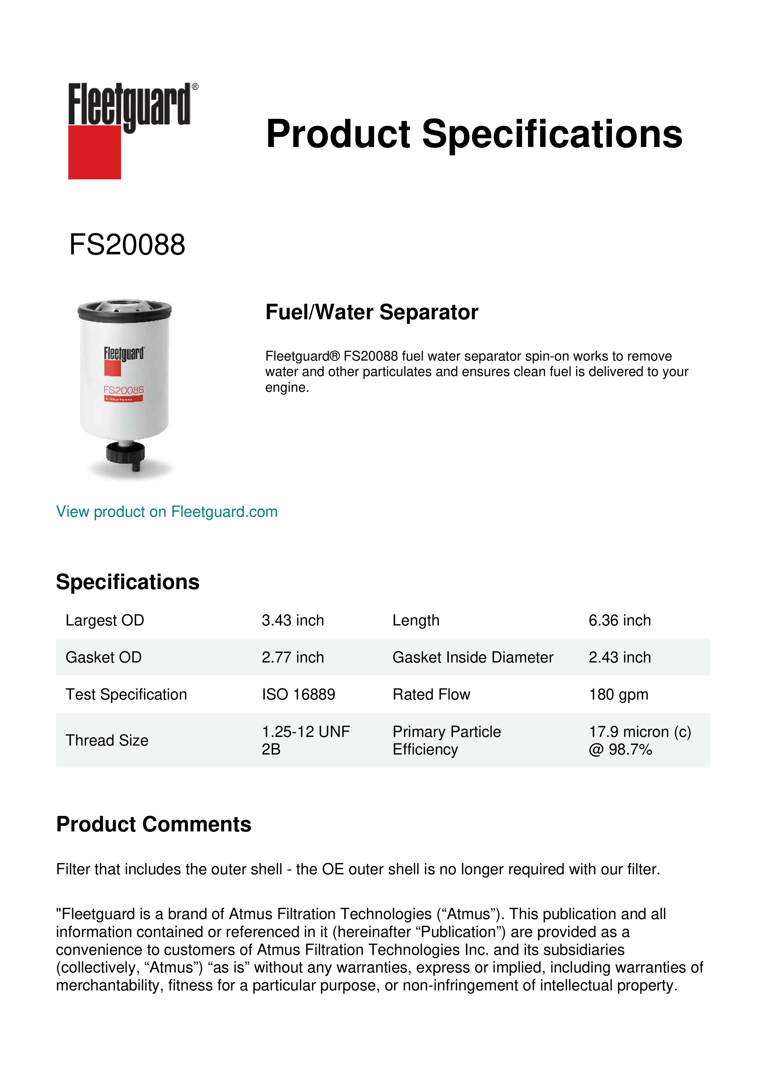 Fleetguard® FS20088 fuel water separator spin-on works to remove water and other particulates and ensures clean fuel is delivered to your engine.Specification