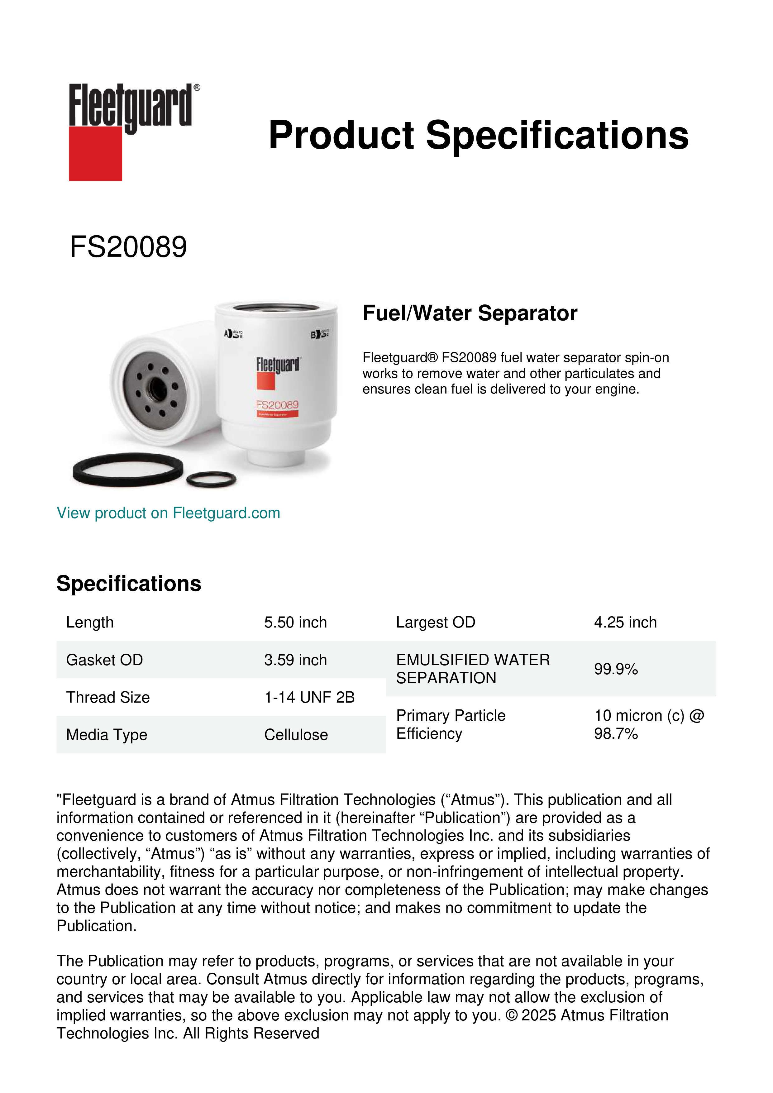 Fleetguard® FS20089 fuel water separator spin-on works to remove water and other particulates and ensures clean fuel is delivered to your engine.Specification