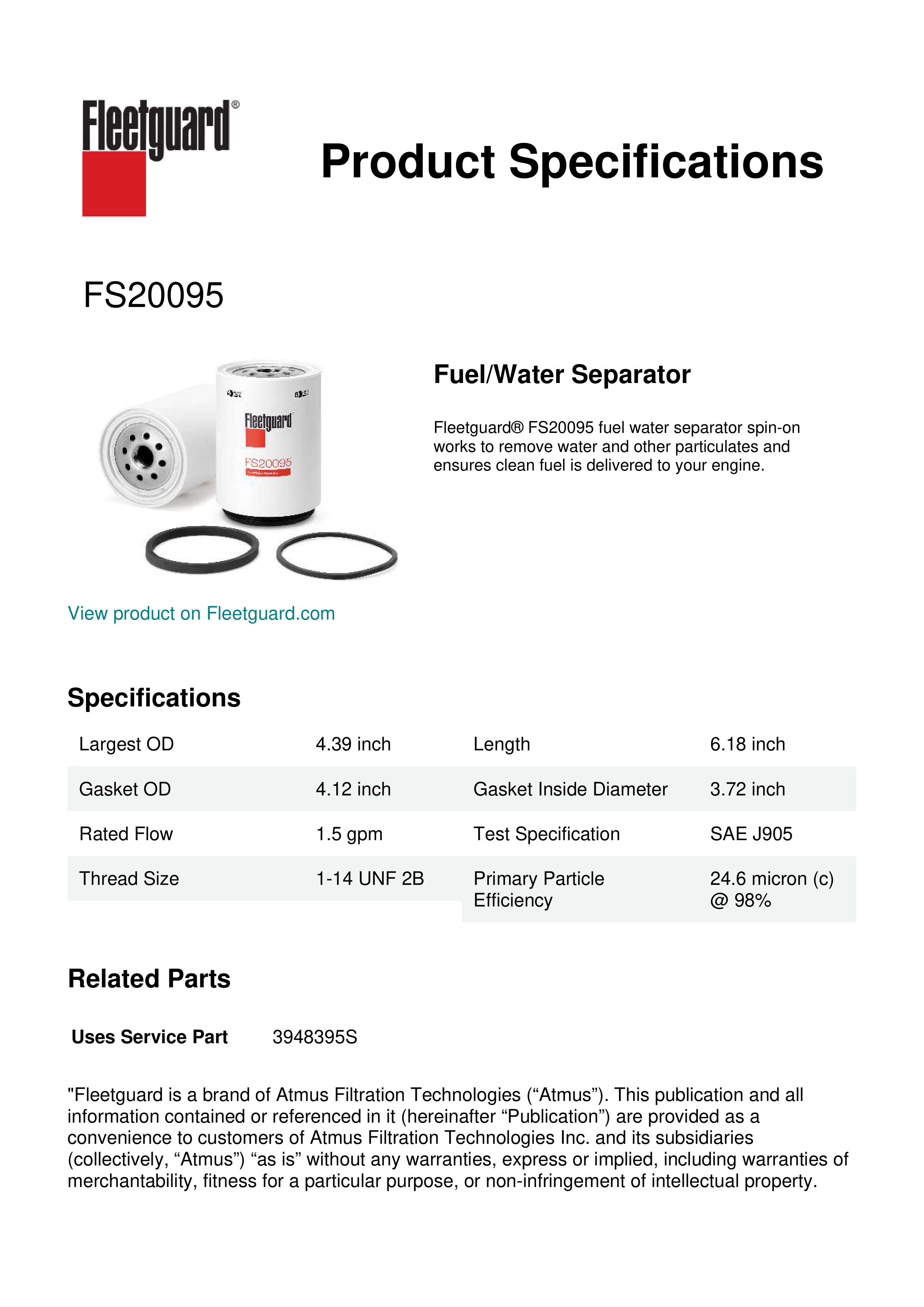 Fleetguard® FS20095 fuel water separator spin-on works to remove water and other particulates and ensures clean fuel is delivered to your engine.Specification