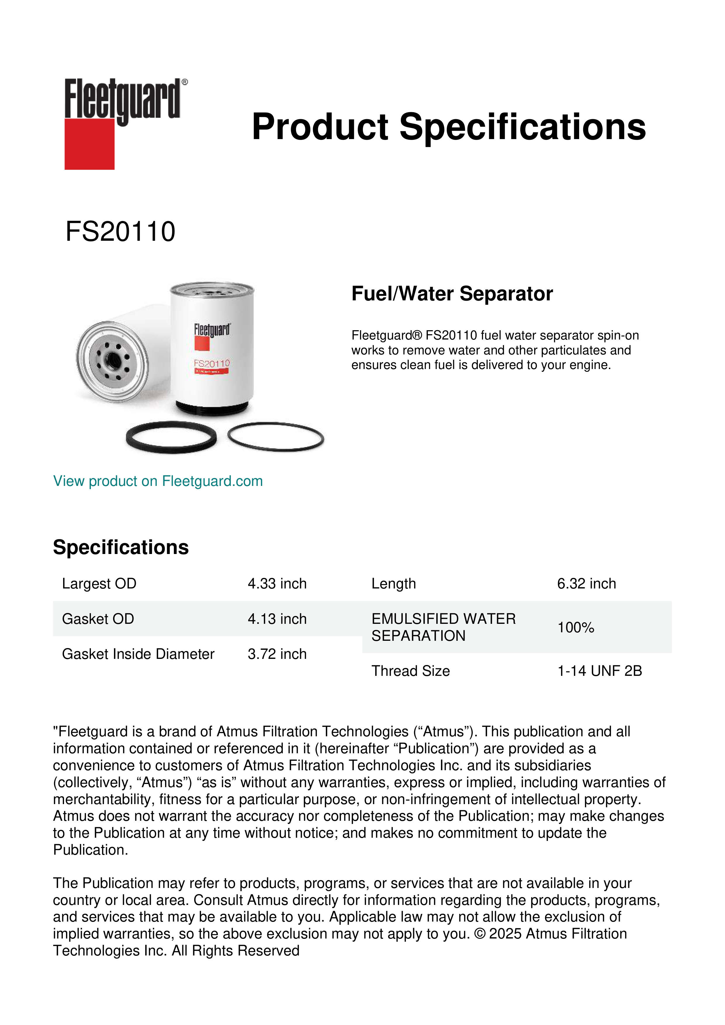 Fleetguard® FS20110 fuel water separator spin-on works to remove water and other particulates and ensures clean fuel is delivered to your engine.Specification