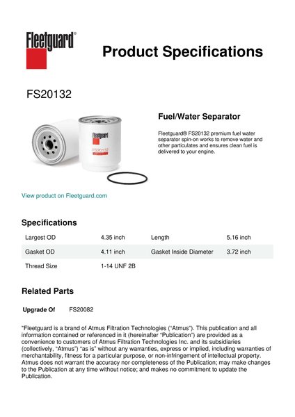 Fleetguard® FS20132 premium fuel water separator spin-on works to remove water and other particulates and ensures clean fuel is delivered to your engine.Specification