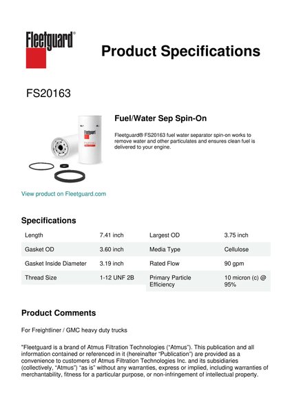 Fleetguard® FS20163 fuel water separator spin-on works to remove water and other particulates and ensures clean fuel is delivered to your engine.Specification