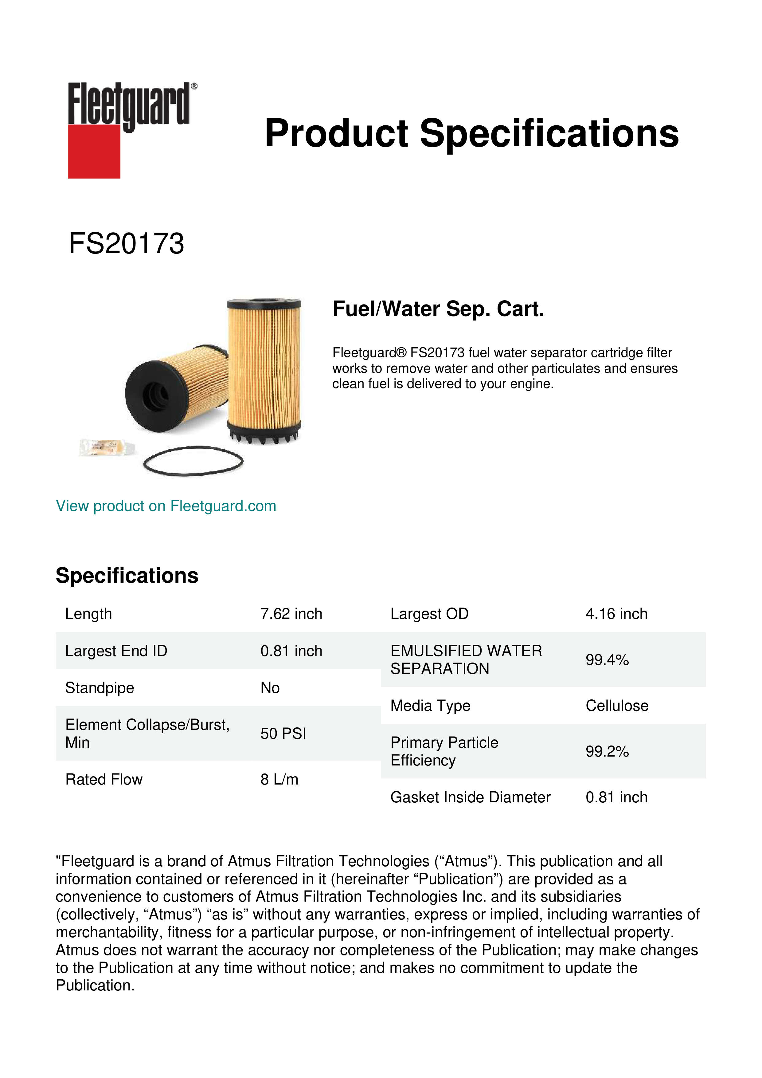 Fleetguard® FS20173 fuel water separator cartridge filter works to remove water and other particulates and ensures clean fuel is delivered to your engine.Specification