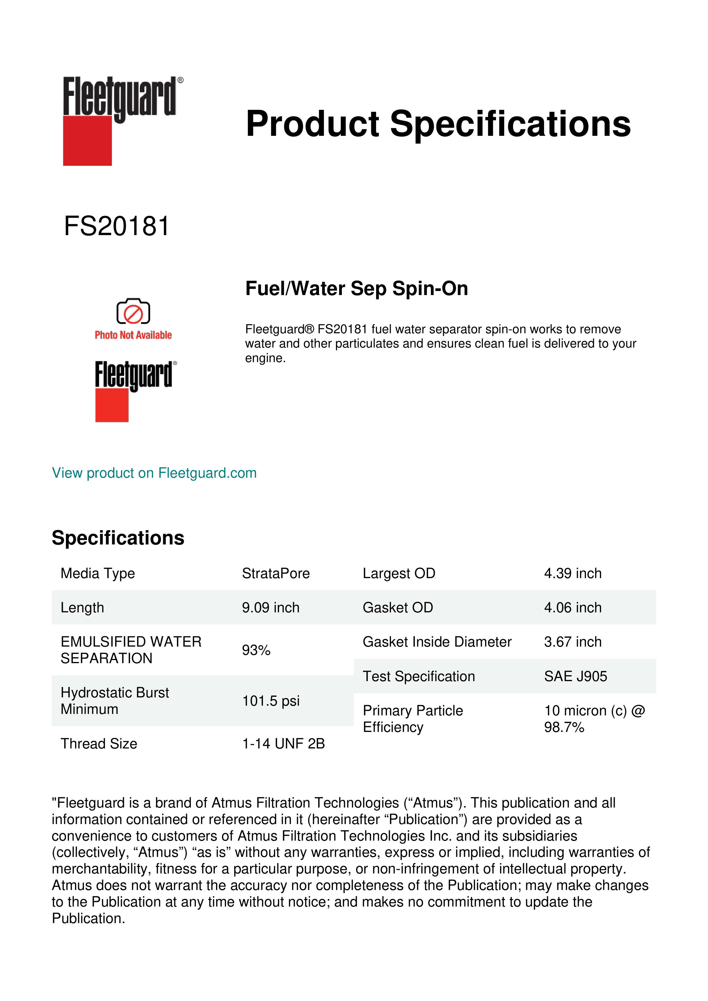 Fleetguard® FS20181 fuel water separator spin-on works to remove water and other particulates and ensures clean fuel is delivered to your engine.Specification