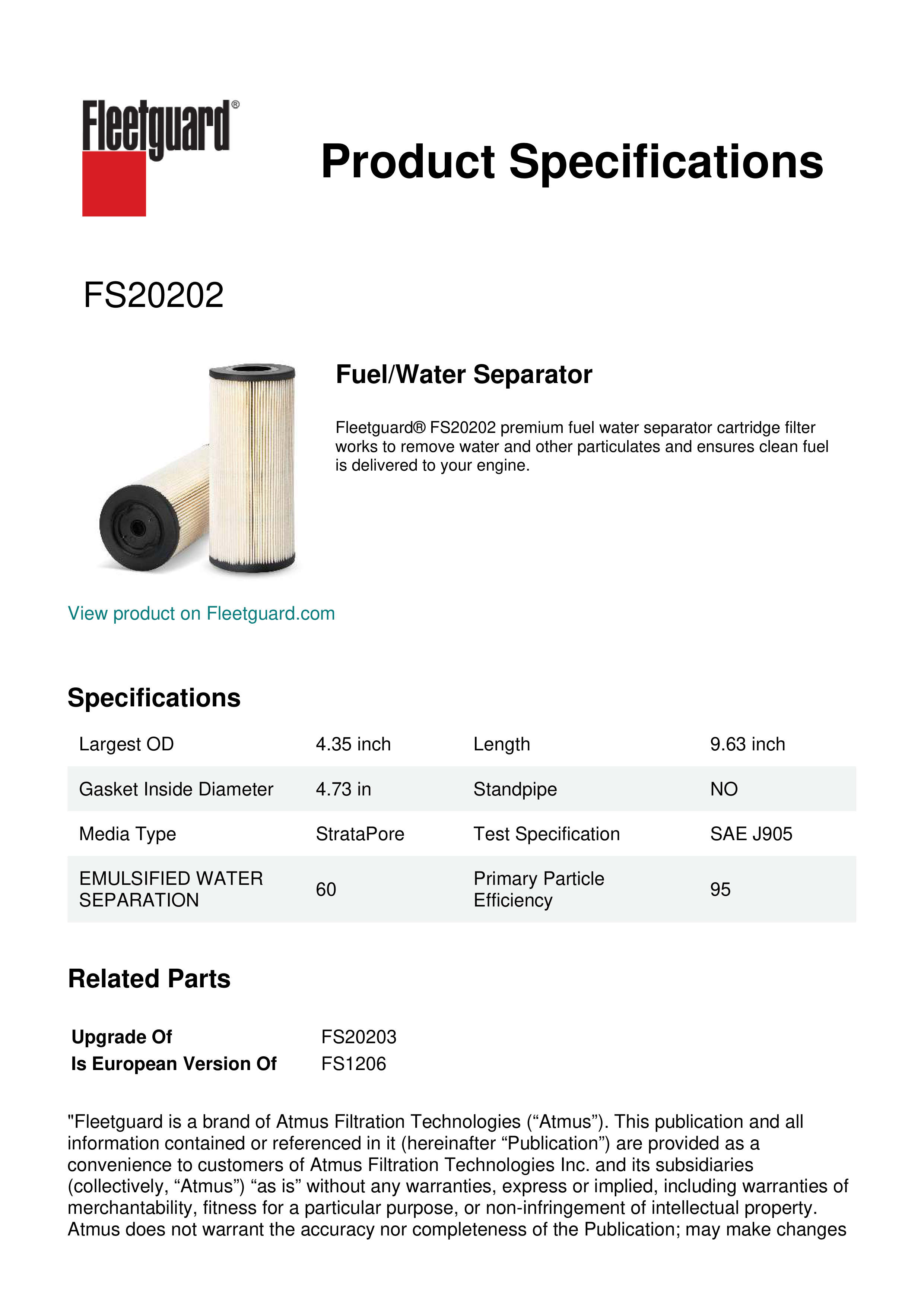 Fleetguard® FS20202 premium fuel water separator cartridge filter works to remove water and other particulates and ensures clean fuel is delivered to your engine.Specification