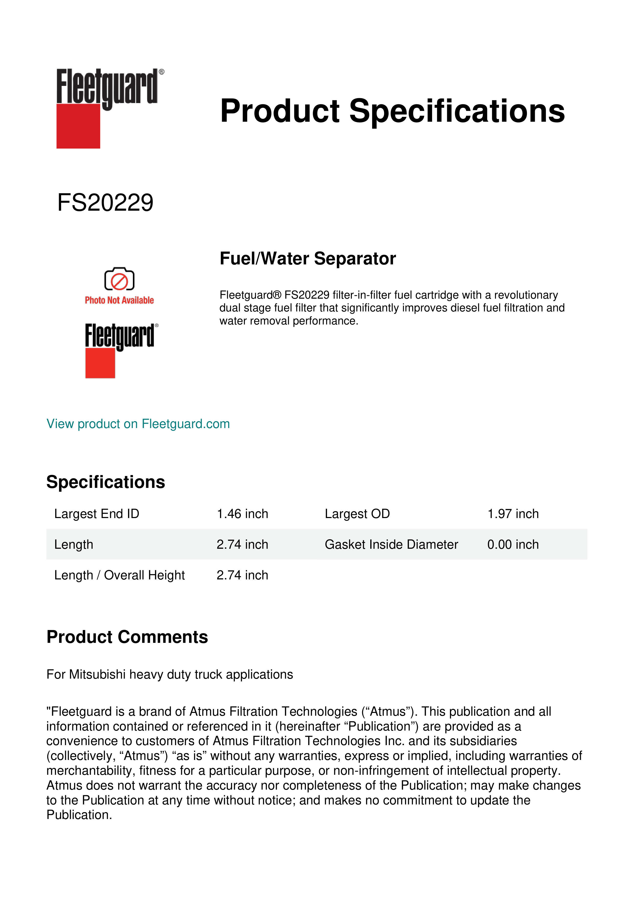 Fleetguard® FS20229 filter-in-filter fuel cartridge with a revolutionary dual stage fuel filter that significantly improves diesel fuel filtration and water removal performance.Specification