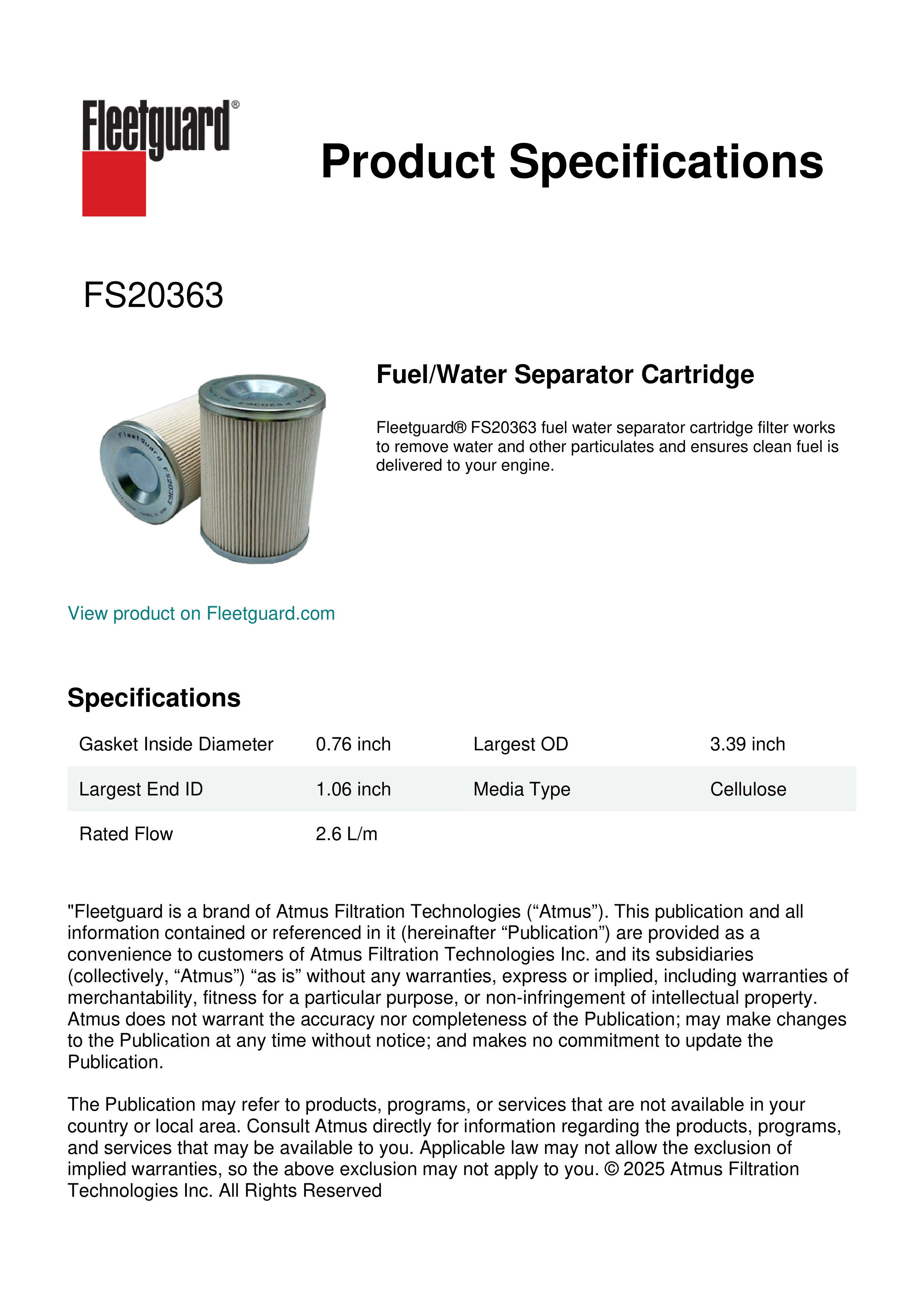 Fleetguard® FS20363 fuel water separator cartridge filter works to remove water and other particulates and ensures clean fuel is delivered to your engine.Specification