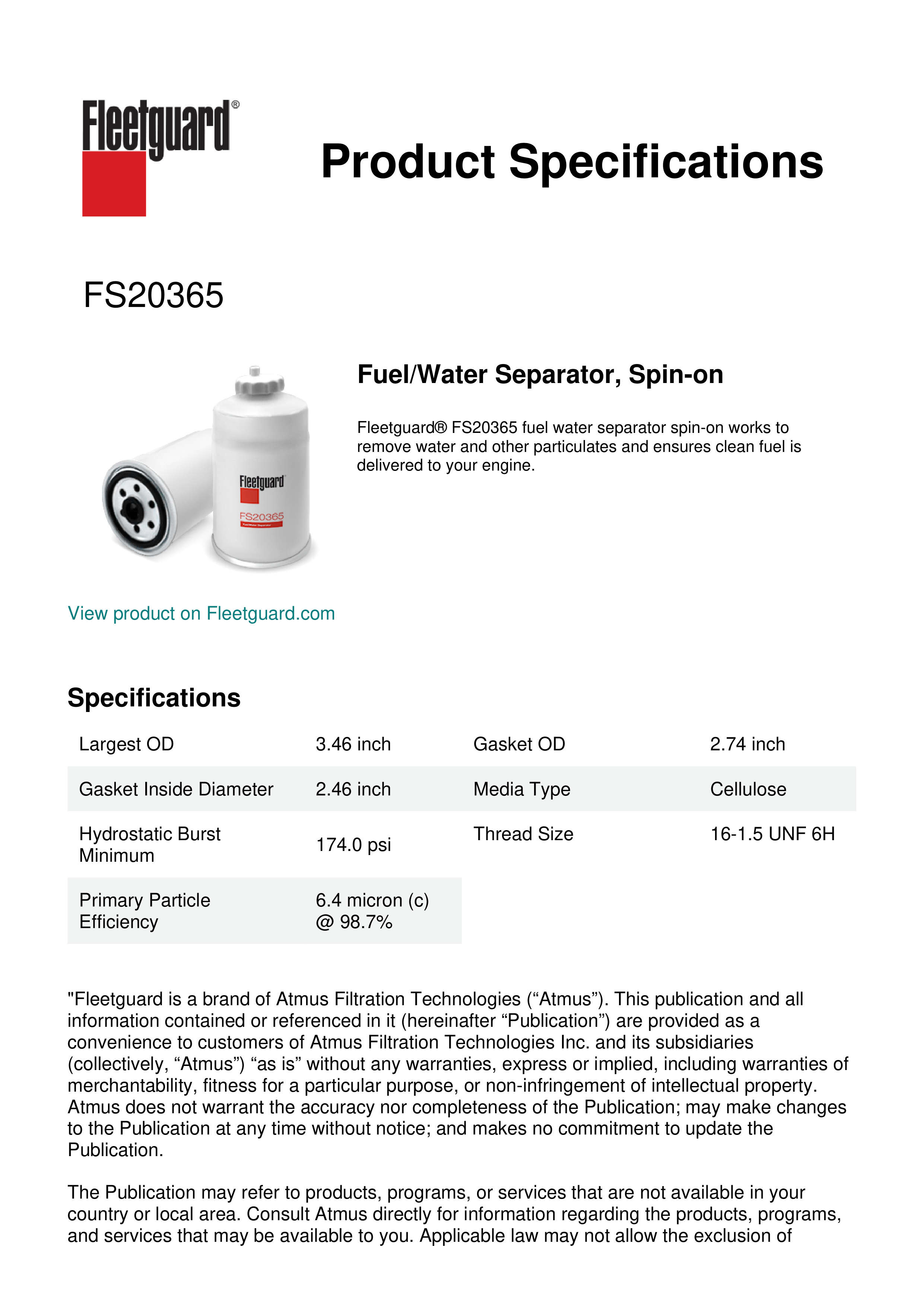 Fleetguard® FS20365 fuel water separator spin-on works to remove water and other particulates and ensures clean fuel is delivered to your engine.Specification