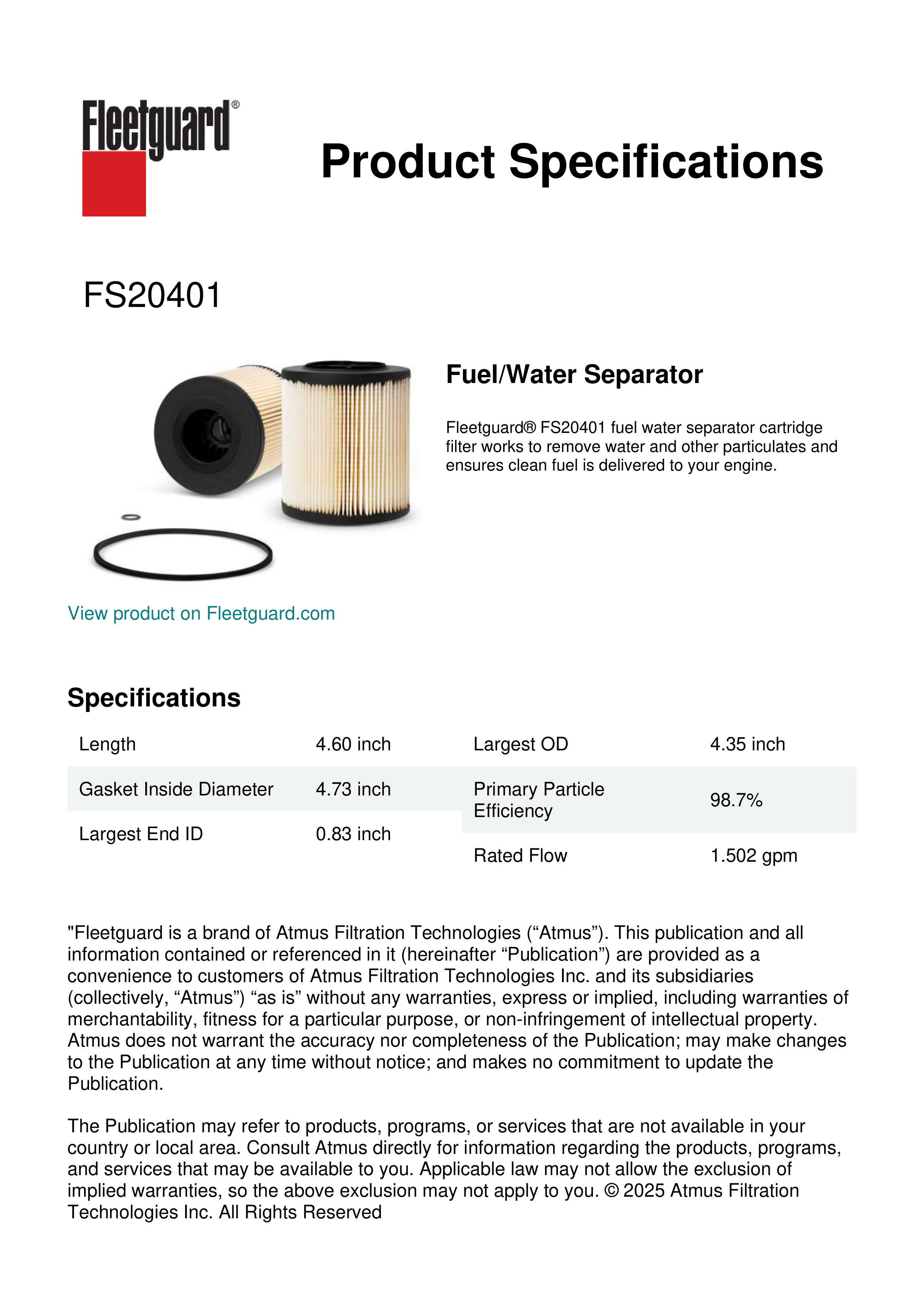 Fleetguard® FS20401 fuel water separator cartridge filter works to remove water and other particulates and ensures clean fuel is delivered to your engine.Specification