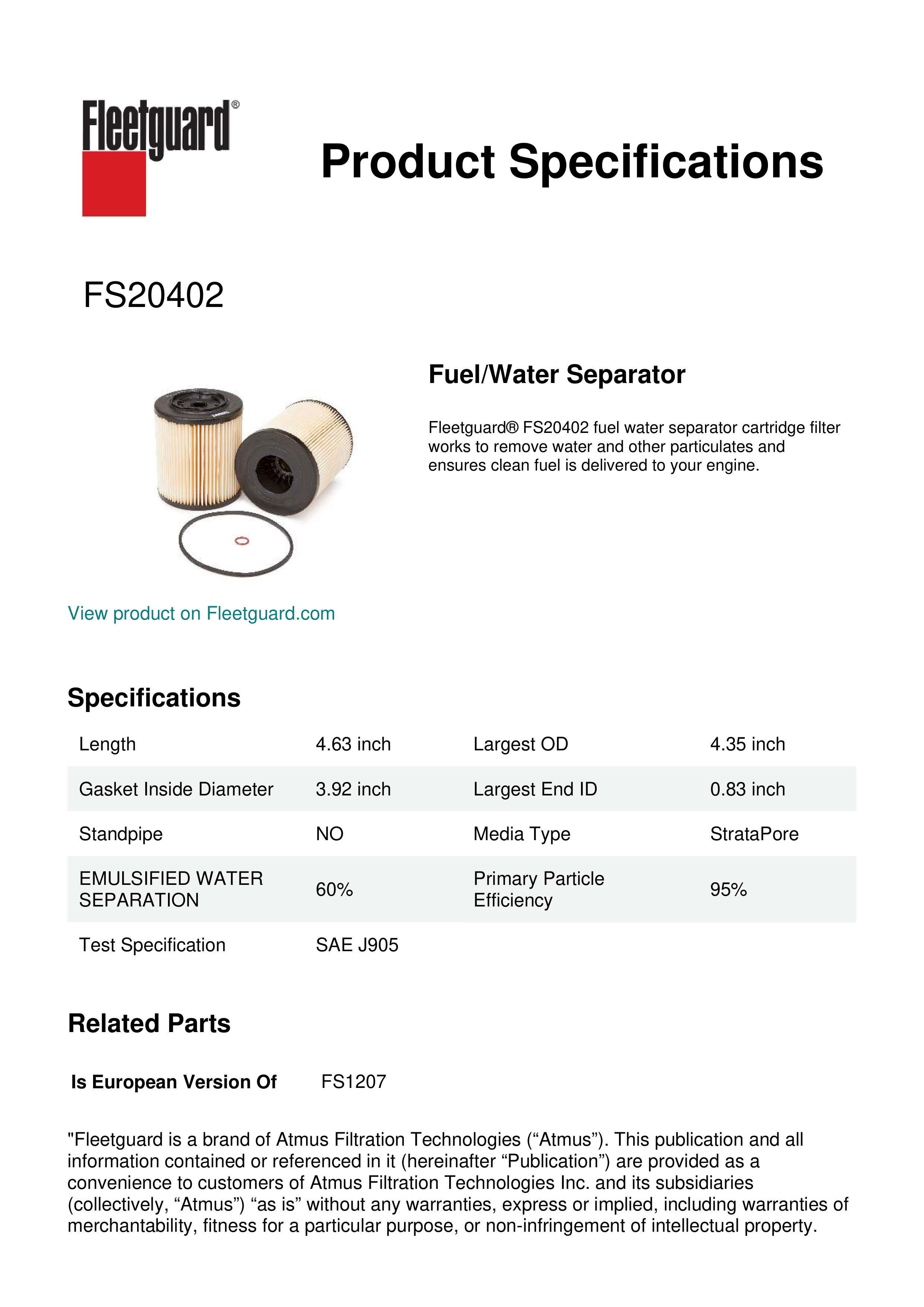 Fleetguard® FS20402 fuel water separator cartridge filter works to remove water and other particulates and ensures clean fuel is delivered to your engine.Specification