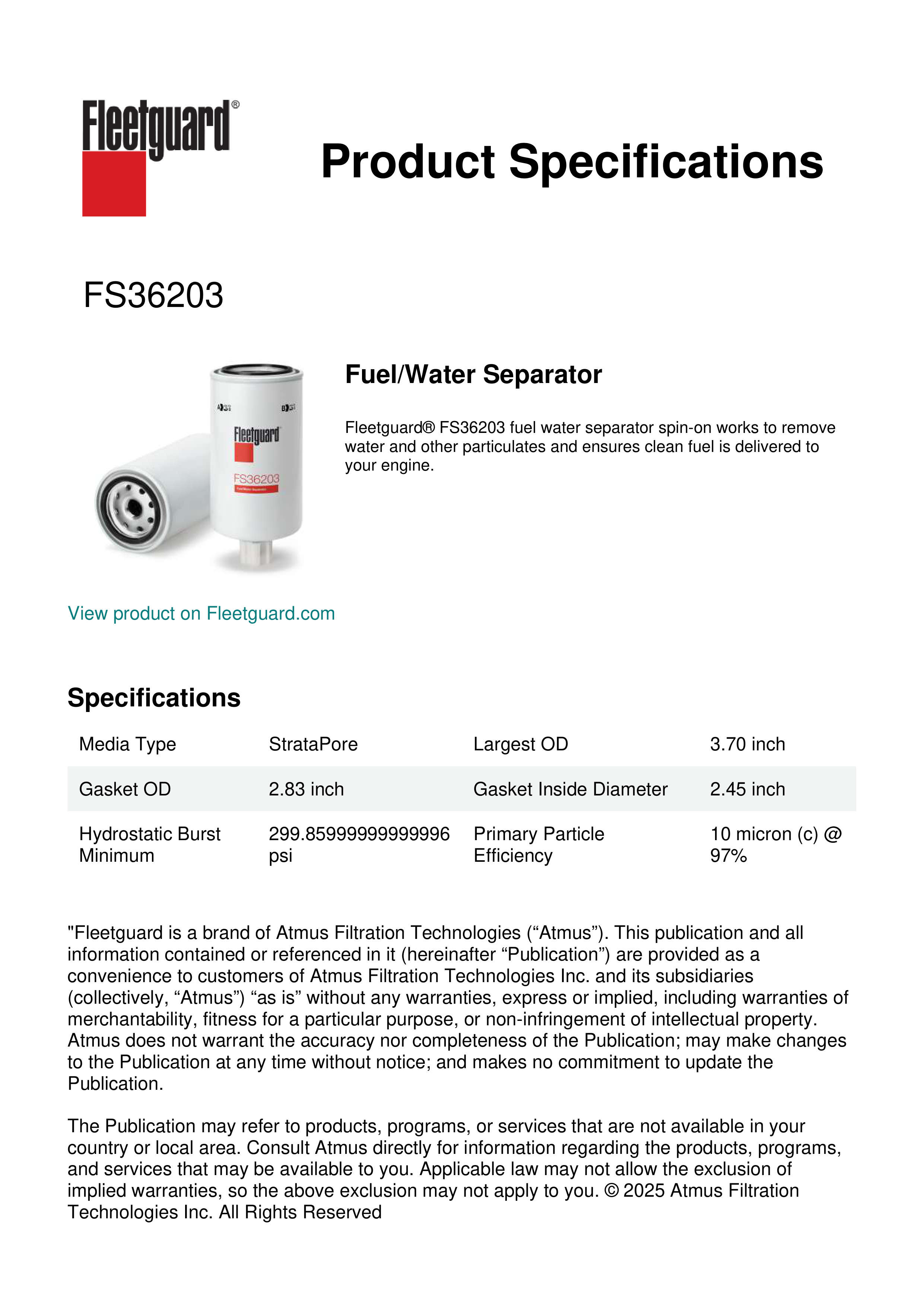 Fleetguard® FS36203 fuel water separator spin-on works to remove water and other particulates and ensures clean fuel is delivered to your engine.Specification