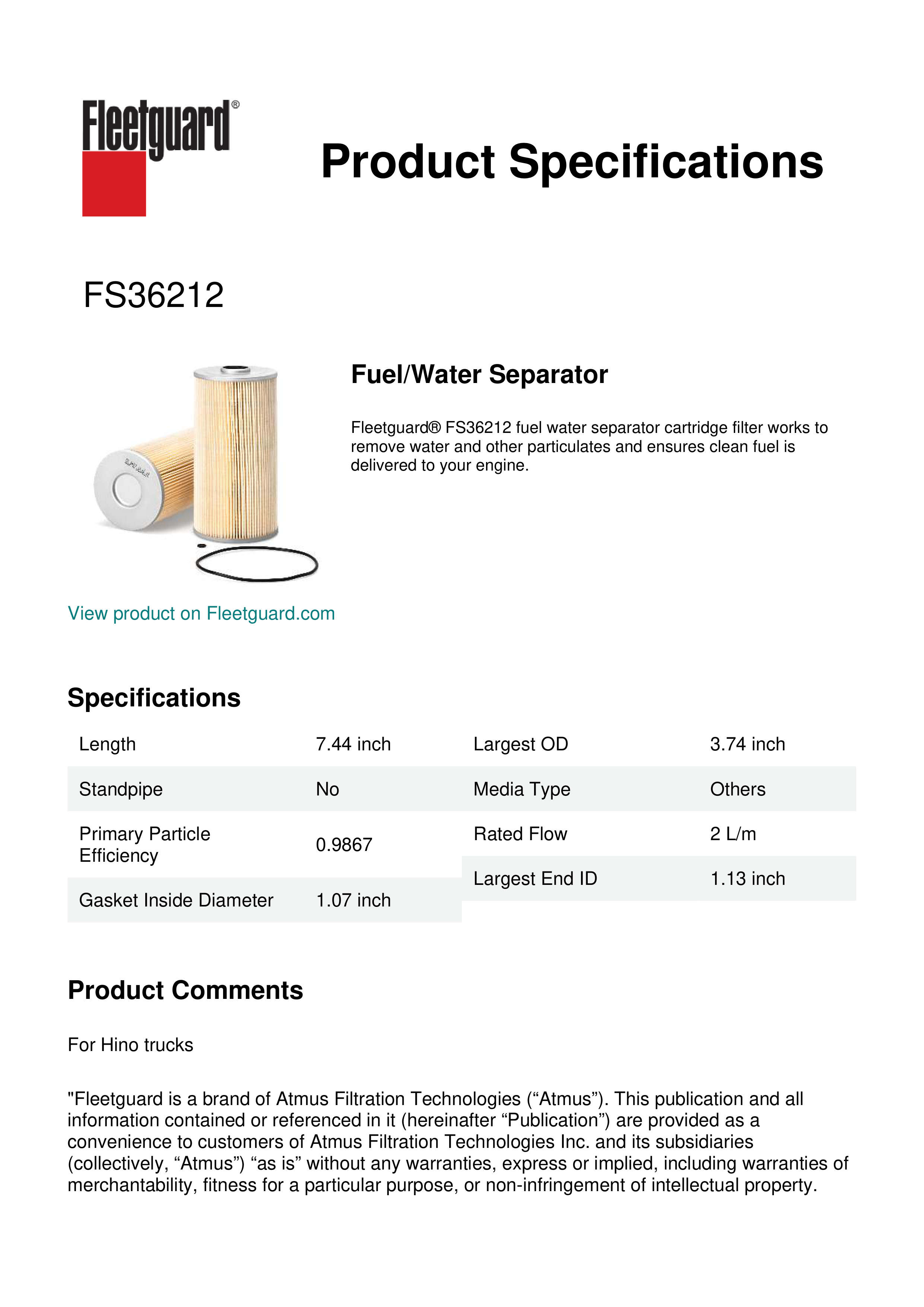 Fleetguard® FS36212 fuel water separator cartridge filter works to remove water and other particulates and ensures clean fuel is delivered to your engine.Specification