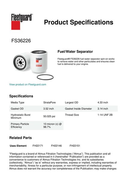Fleetguard® FS36226 fuel water separator spin-on works to remove water and other particulates and ensures clean fuel is delivered to your engine.Specification