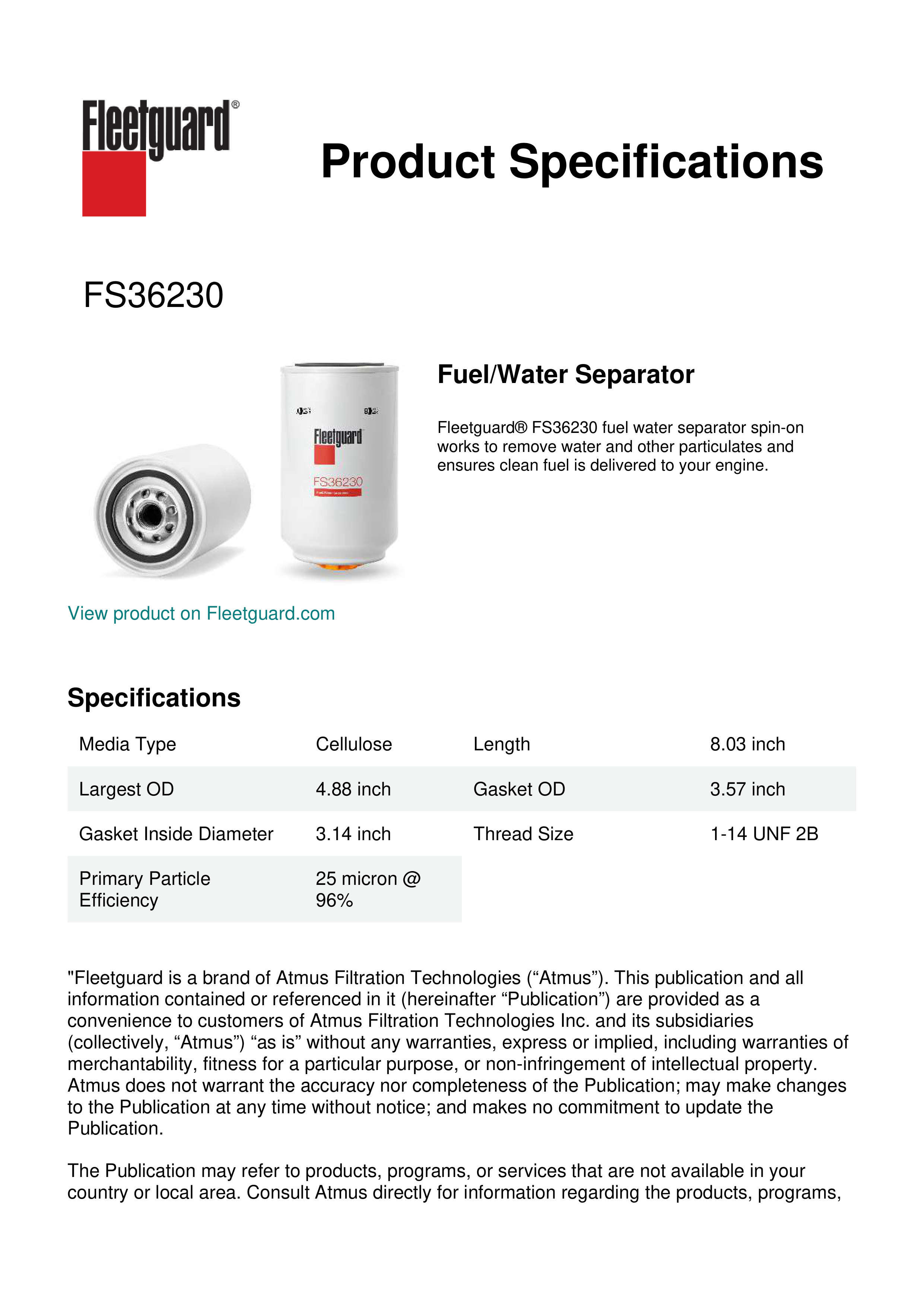 Fleetguard® FS36230 fuel water separator spin-on works to remove water and other particulates and ensures clean fuel is delivered to your engine.Specification