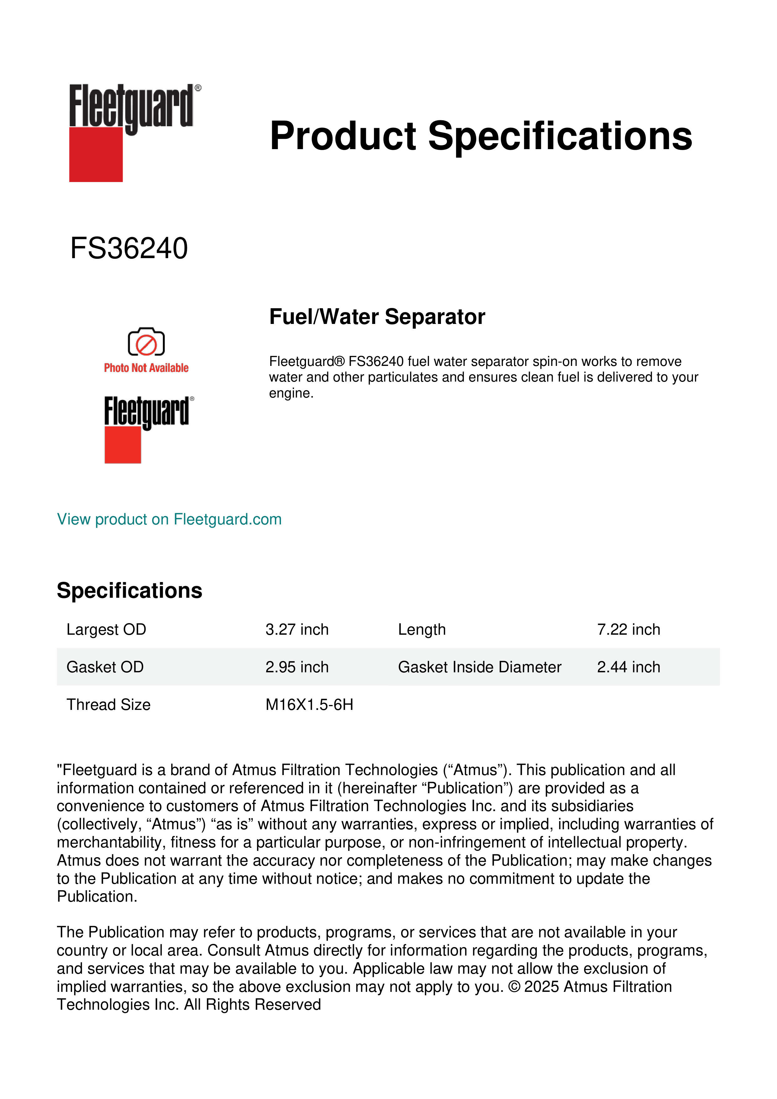Fleetguard® FS36240 fuel water separator spin-on works to remove water and other particulates and ensures clean fuel is delivered to your engine.Specification