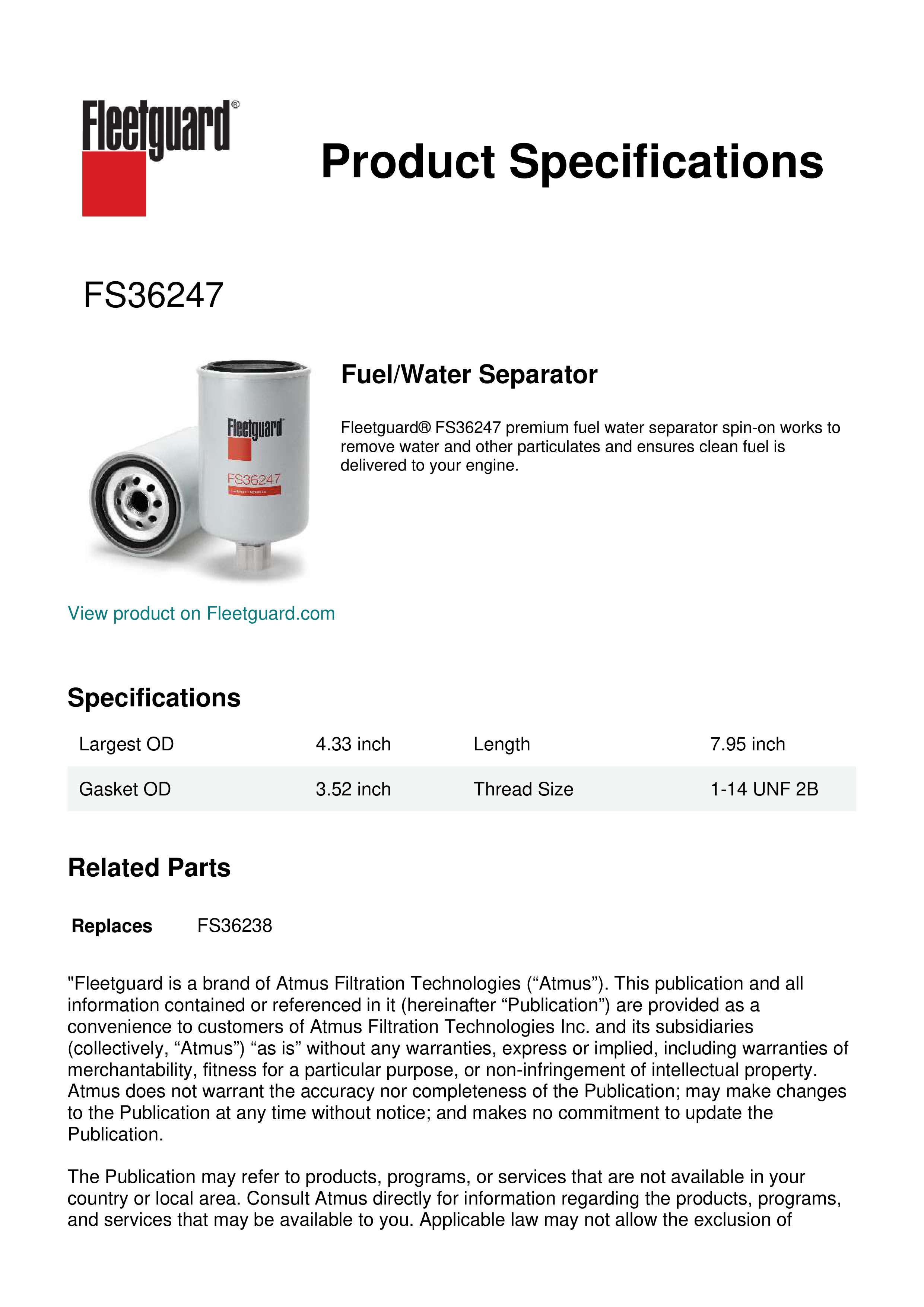 Fleetguard® FS36247 premium fuel water separator spin-on works to remove water and other particulates and ensures clean fuel is delivered to your engine.Specification