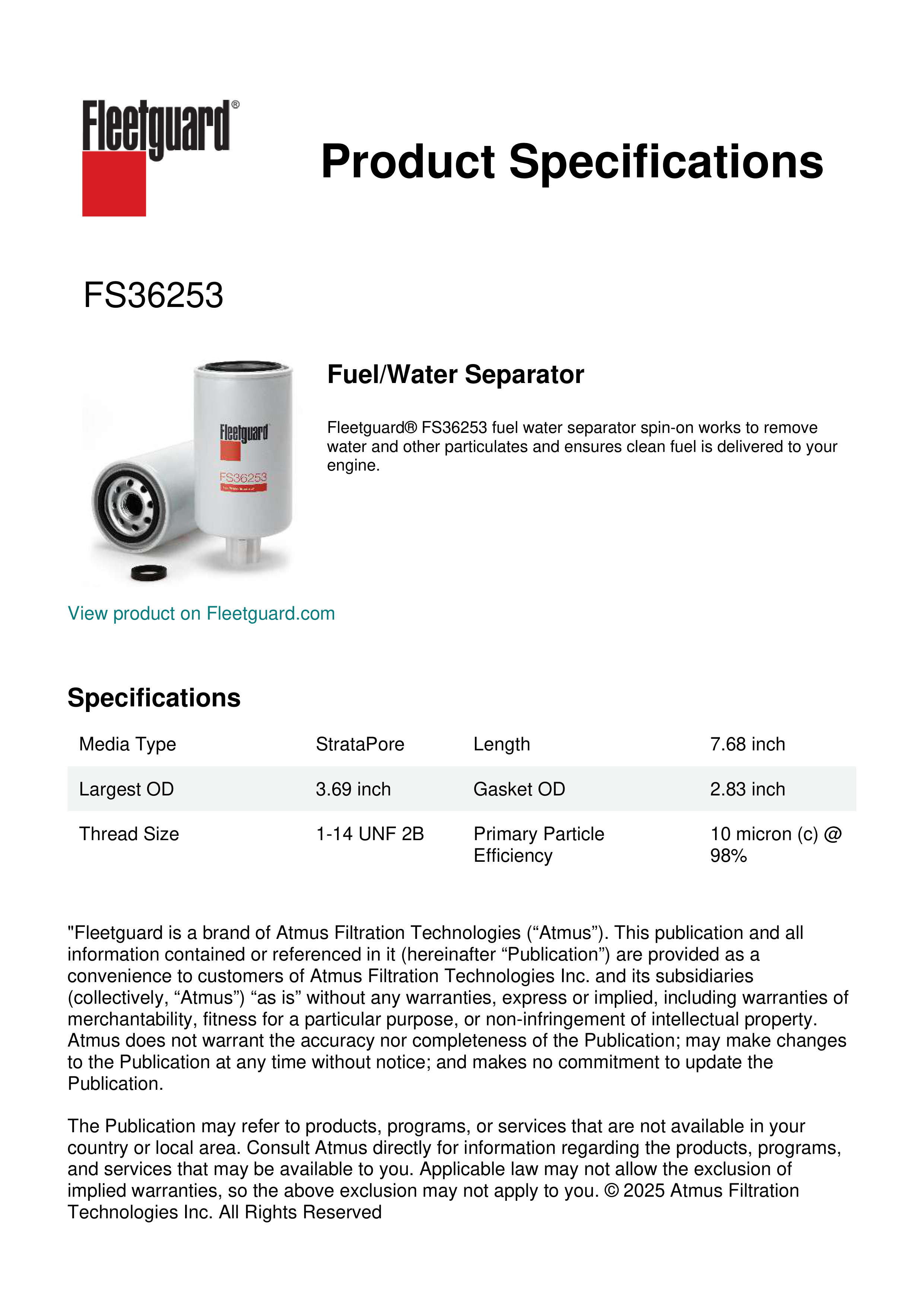 Fleetguard® FS36253 fuel water separator spin-on works to remove water and other particulates and ensures clean fuel is delivered to your engine.Specification