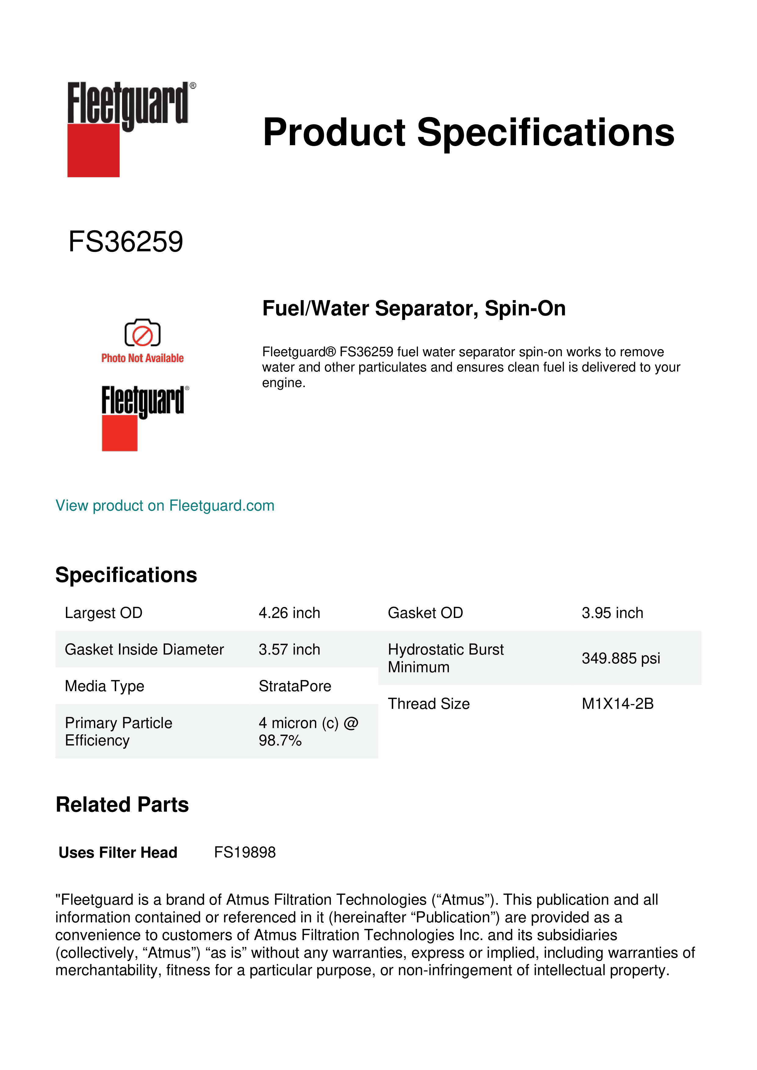 Fleetguard® FS36259 fuel water separator spin-on works to remove water and other particulates and ensures clean fuel is delivered to your engine.Specification