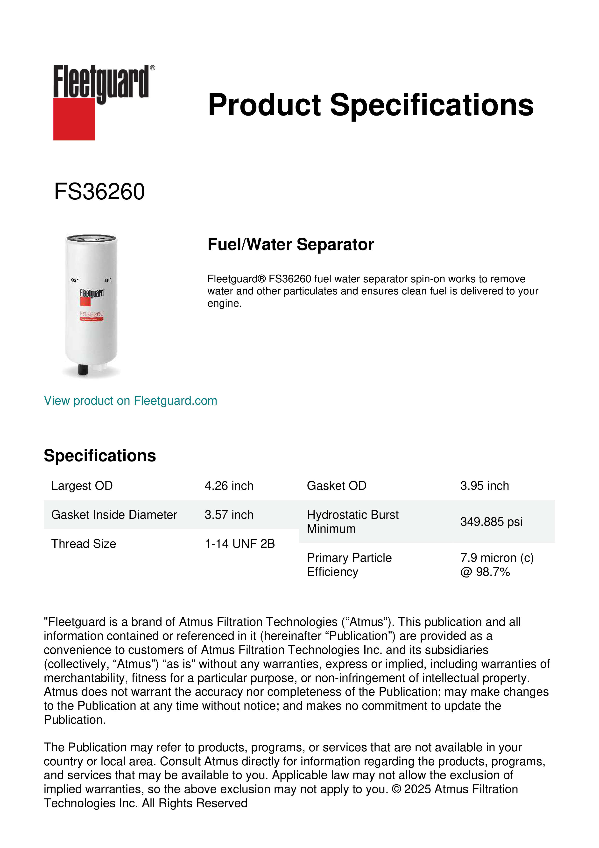 Fleetguard® FS36260 fuel water separator spin-on works to remove water and other particulates and ensures clean fuel is delivered to your engine.Specification