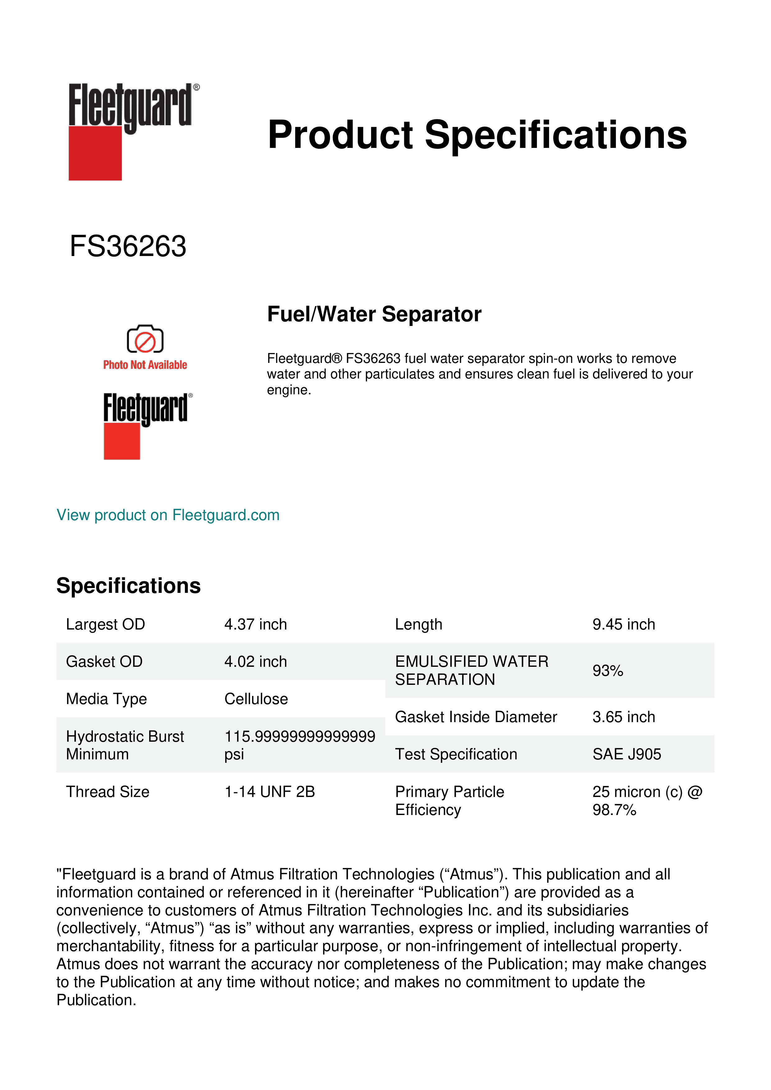 Fleetguard® FS36263 fuel water separator spin-on works to remove water and other particulates and ensures clean fuel is delivered to your engine.Specification