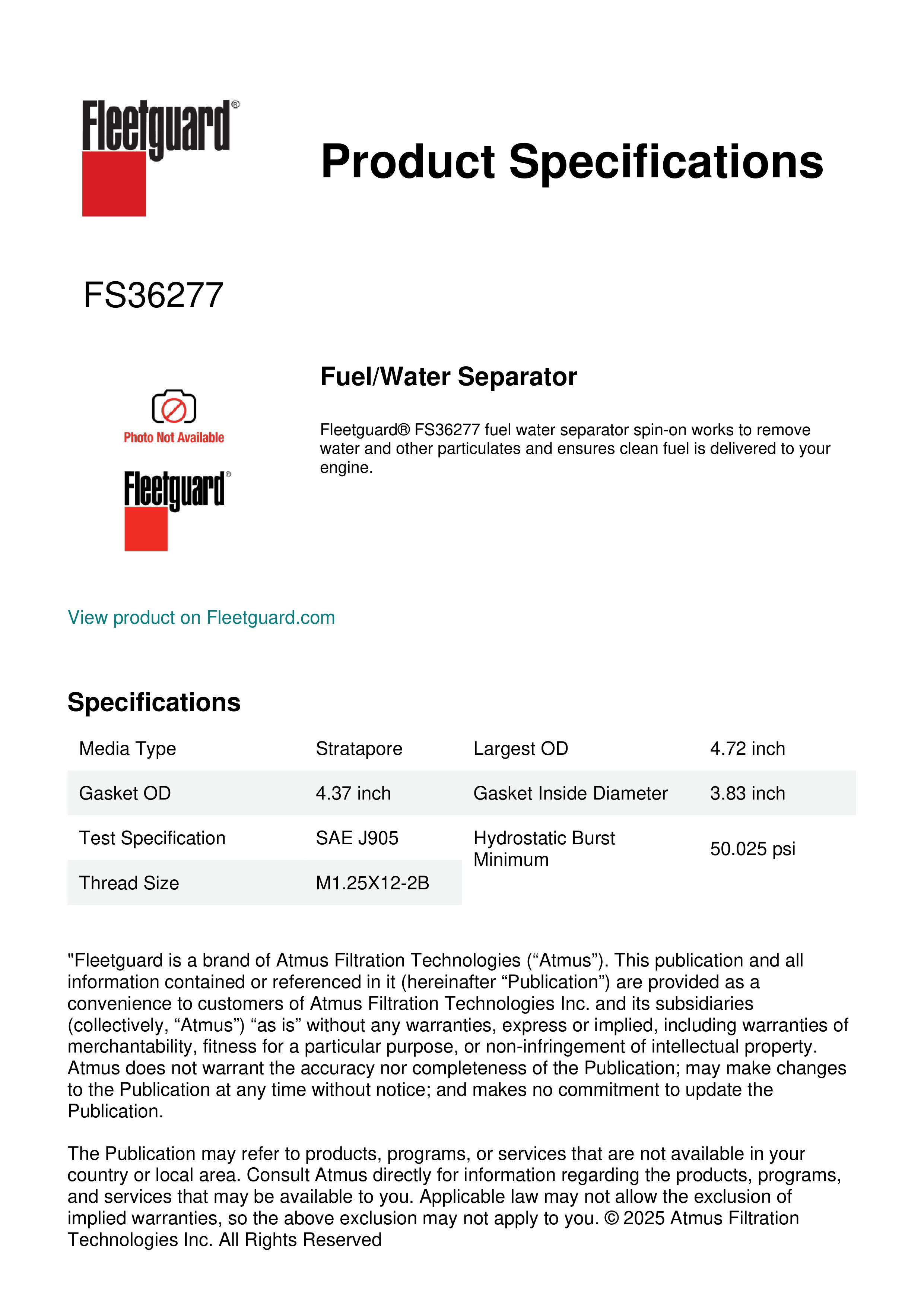 Fleetguard® FS36277 fuel water separator spin-on works to remove water and other particulates and ensures clean fuel is delivered to your engine.Specification