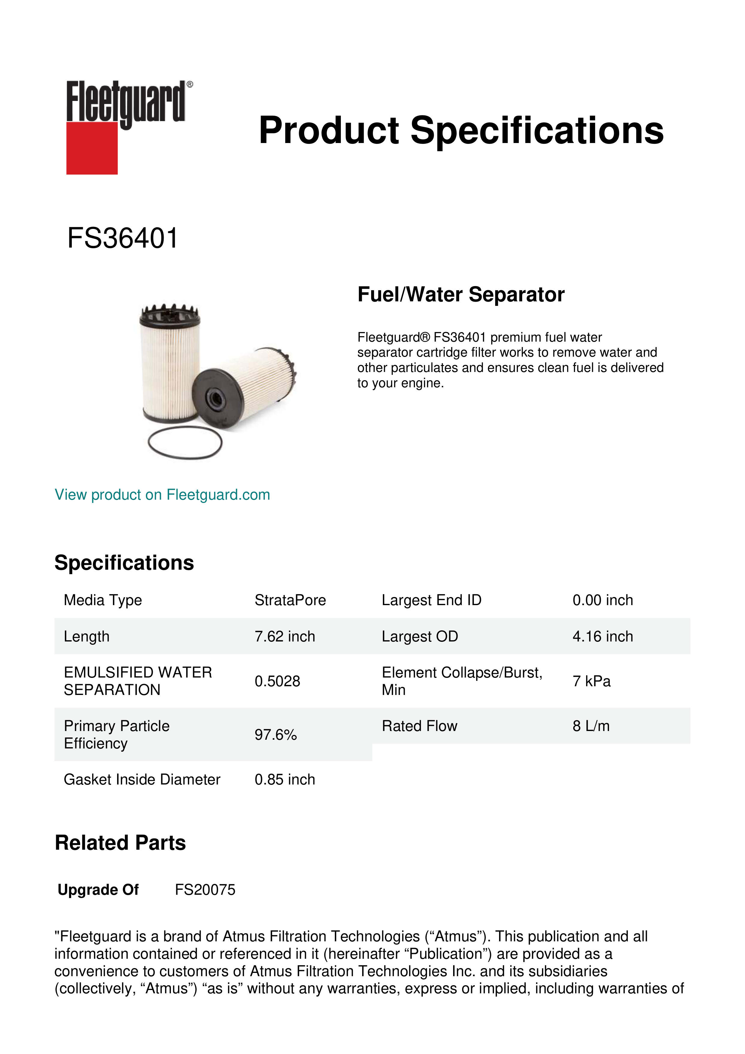 Fleetguard® FS36401 premium fuel water separator cartridge filter works to remove water and other particulates and ensures clean fuel is delivered to your engine.Specification
