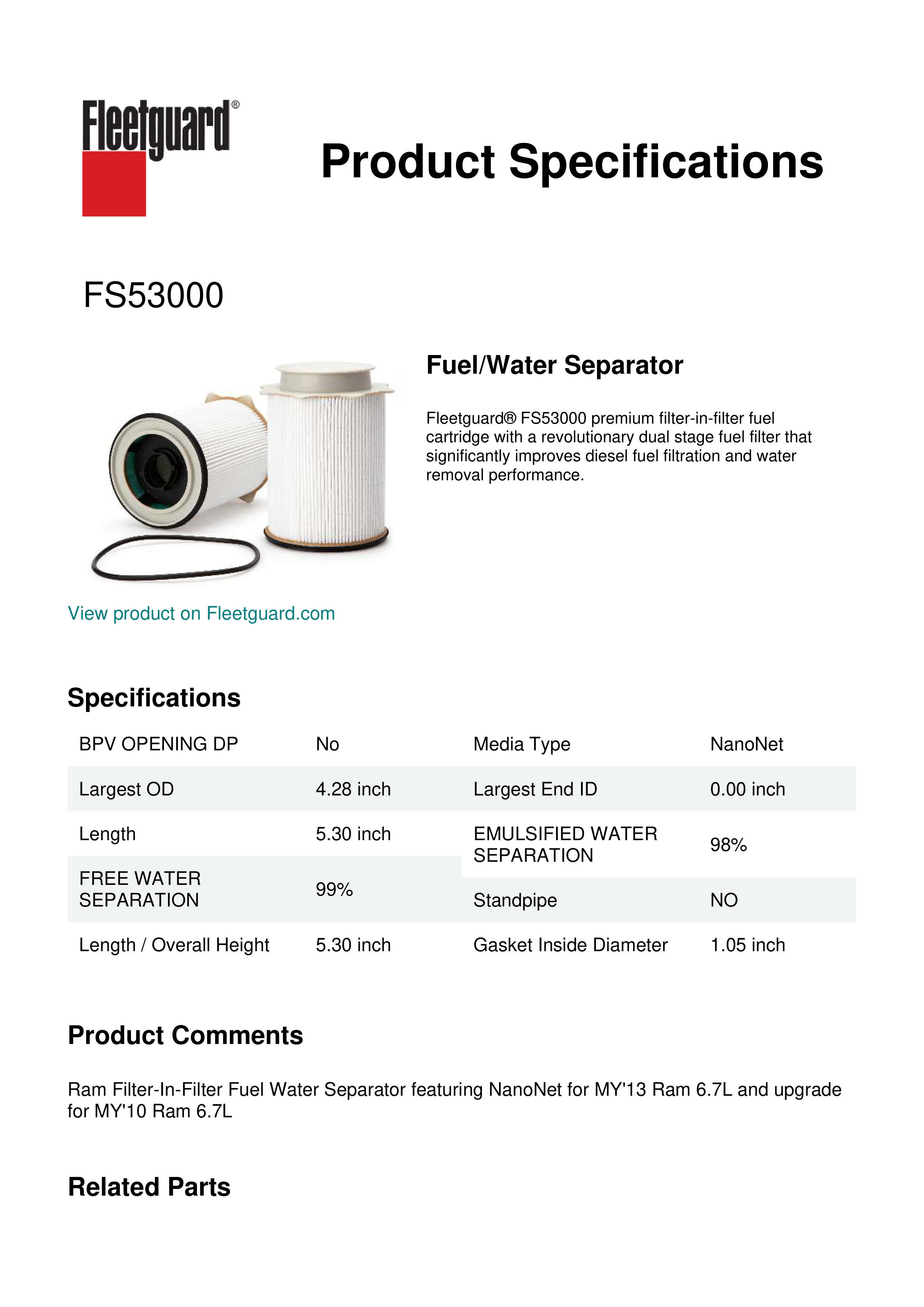 Fleetguard® FS53000 premium filter-in-filter fuel cartridge with a revolutionary dual stage fuel filter that significantly improves diesel fuel filtration and water removal performance.Specification