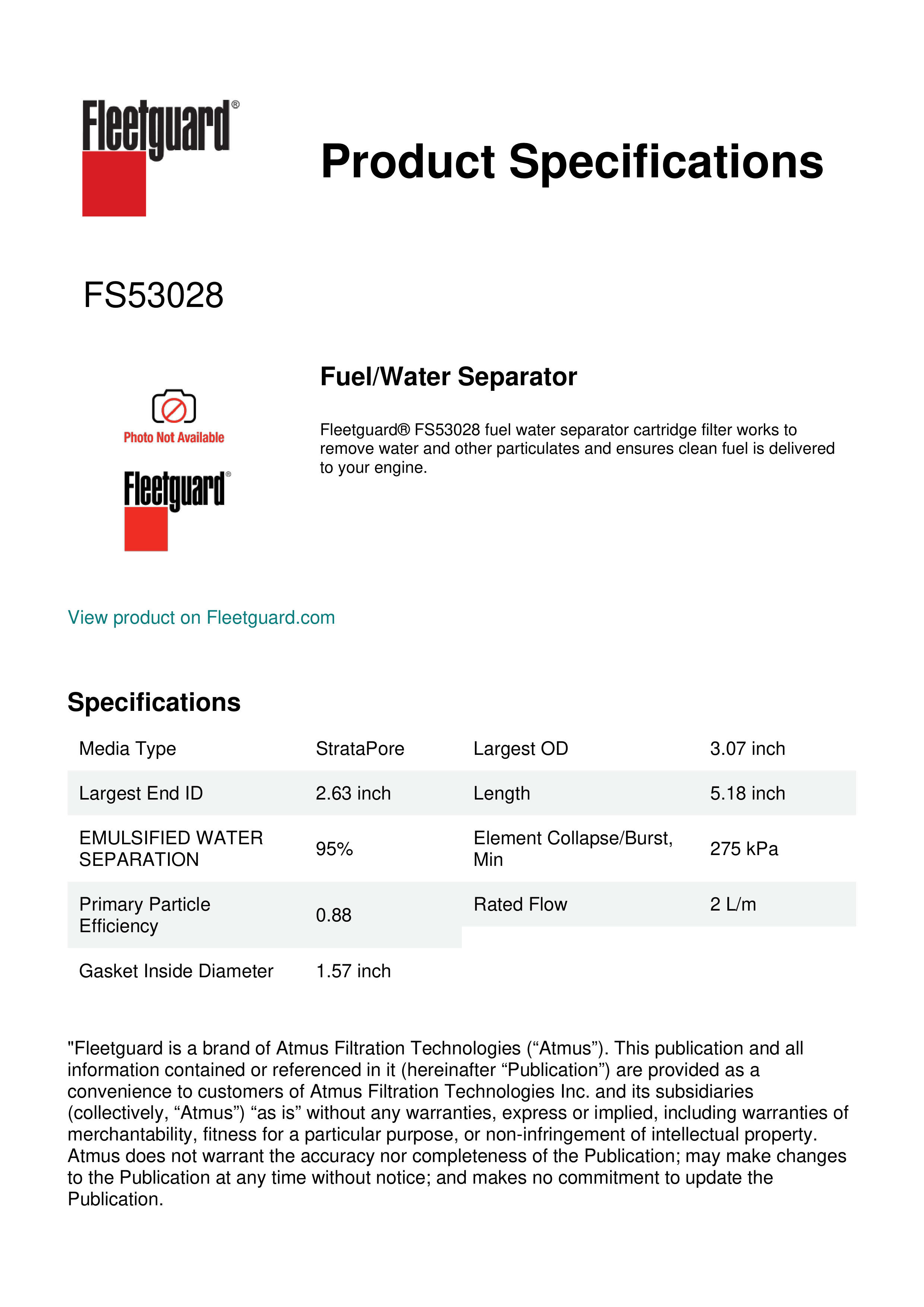 Fleetguard® FS53028 fuel water separator cartridge filter works to remove water and other particulates and ensures clean fuel is delivered to your engine.Specification