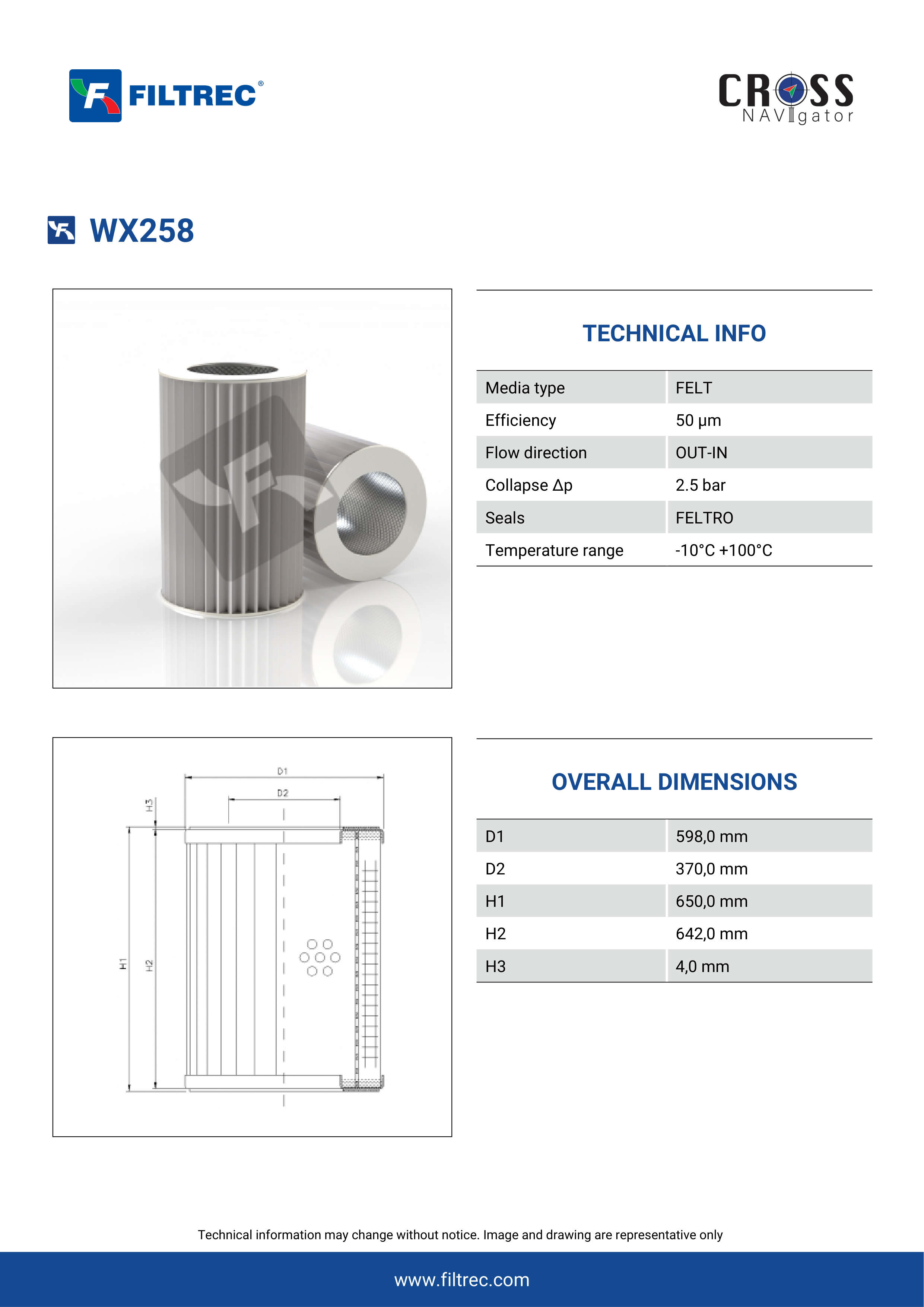 Genuine Filtrec WX258. This Filtrec element is designed to meet or exceed the quality and performance of brand OEM’s ensuring superior filtration performance and long-lasting durability.