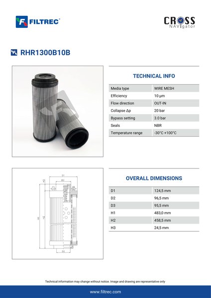 Genuine Filtrec RHR1300B10B. This Filtrec element is designed to meet or exceed the quality and performance of brand OEM’s ensuring superior filtration performance and long-lasting durability.