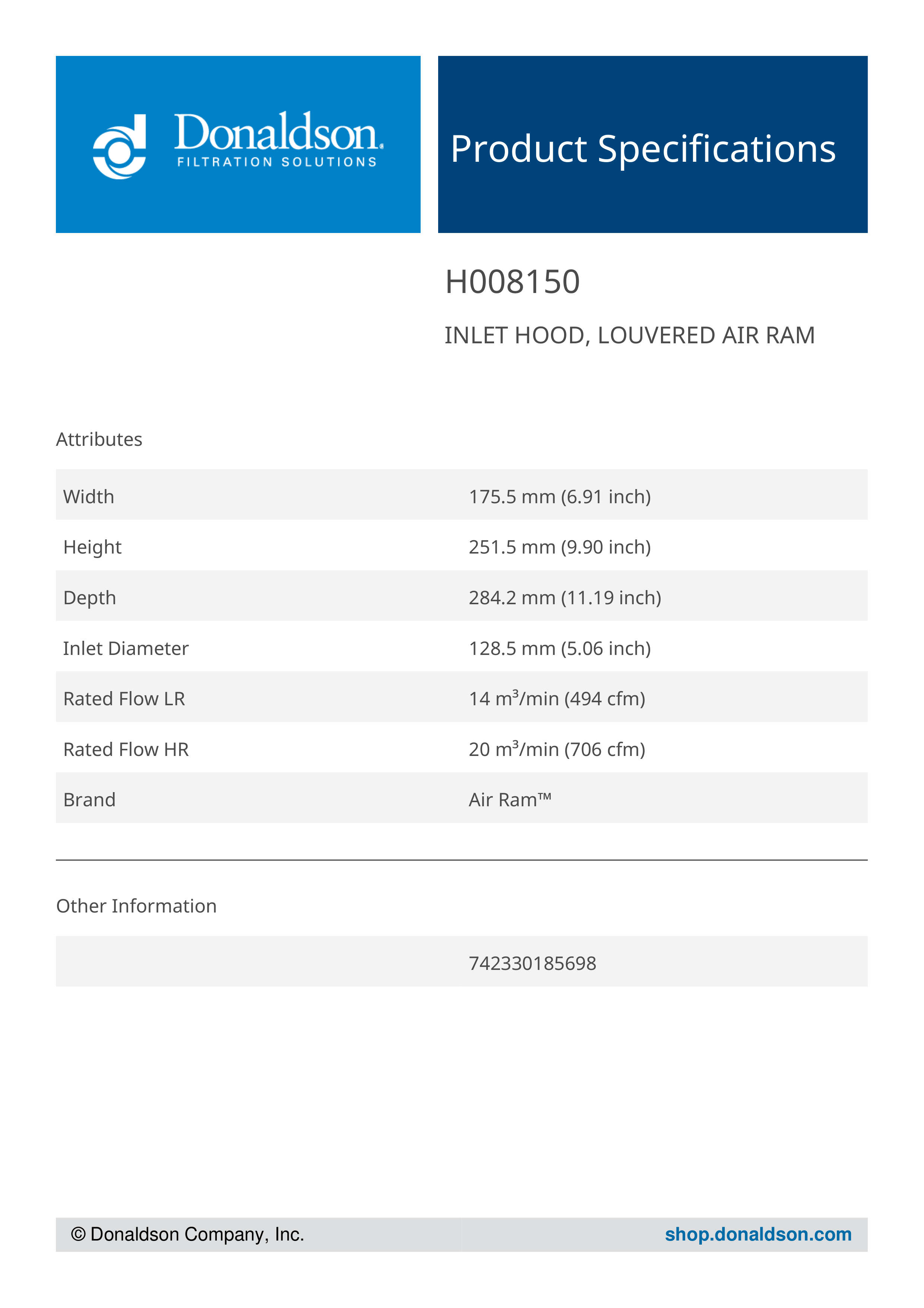Genuine Donaldson H008150 Inlet Hood, Louvered Air Ram is engineered to deliver reliable performance and durability across a wide range of applications. Designed with high-quality materials, it ensures consistent functionality while meeting demanding operational requirements.