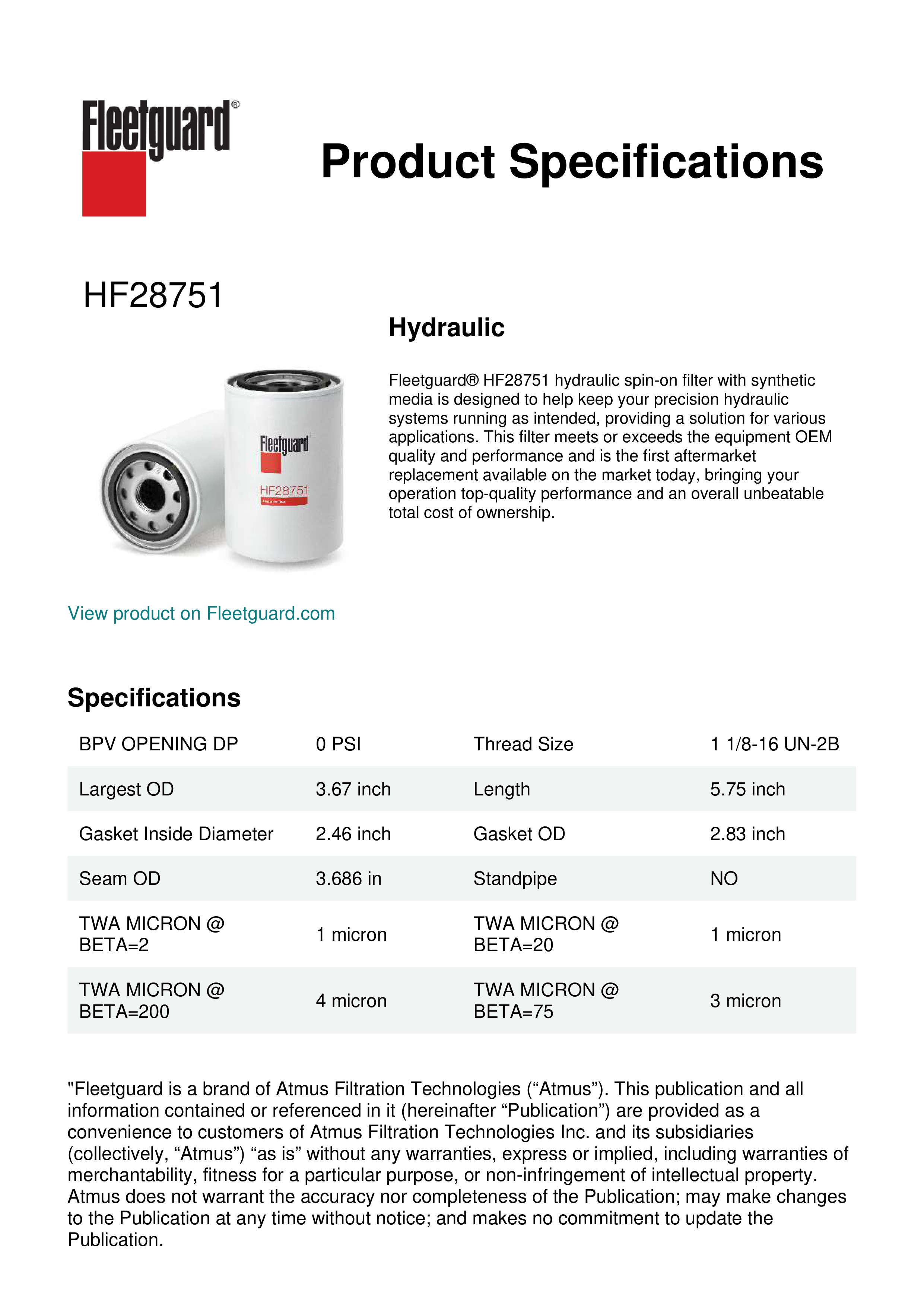 Fleetguard® HF28751 hydraulic spin-on filter with synthetic media is designed to help keep your precision hydraulic systems running as intended, providing a solution for various applications. This filter meets or exceeds the equipment OEM quality and performance and is the first aftermarket replacement available on the market today, bringing your operation top-quality performance and an overall unbeatable total cost of ownership.Specification