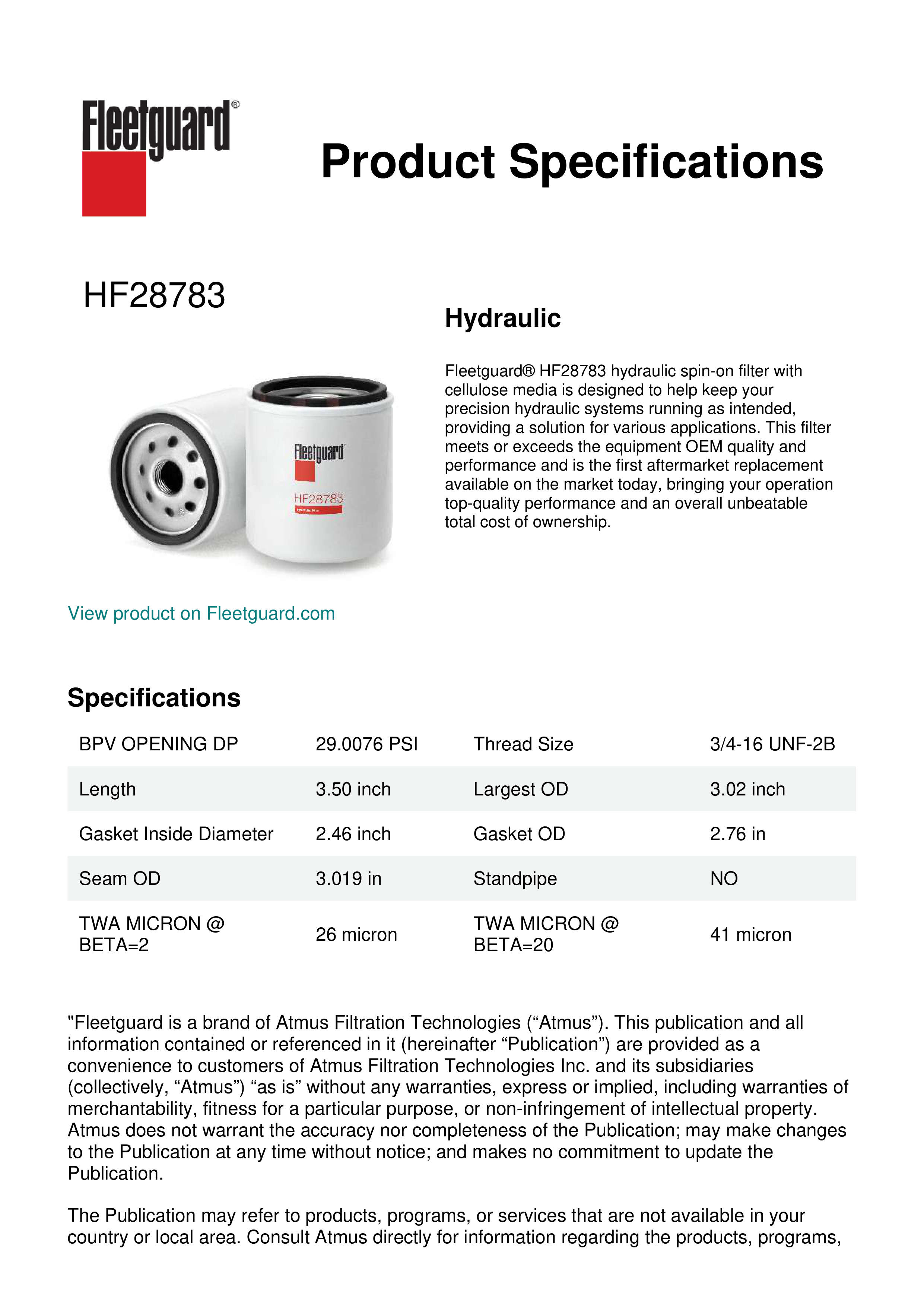 Fleetguard® HF28783 hydraulic spin-on filter with cellulose media is designed to help keep your precision hydraulic systems running as intended, providing a solution for various applications. This filter meets or exceeds the equipment OEM quality and performance and is the first aftermarket replacement available on the market today, bringing your operation top-quality performance and an overall unbeatable total cost of ownership.Specification