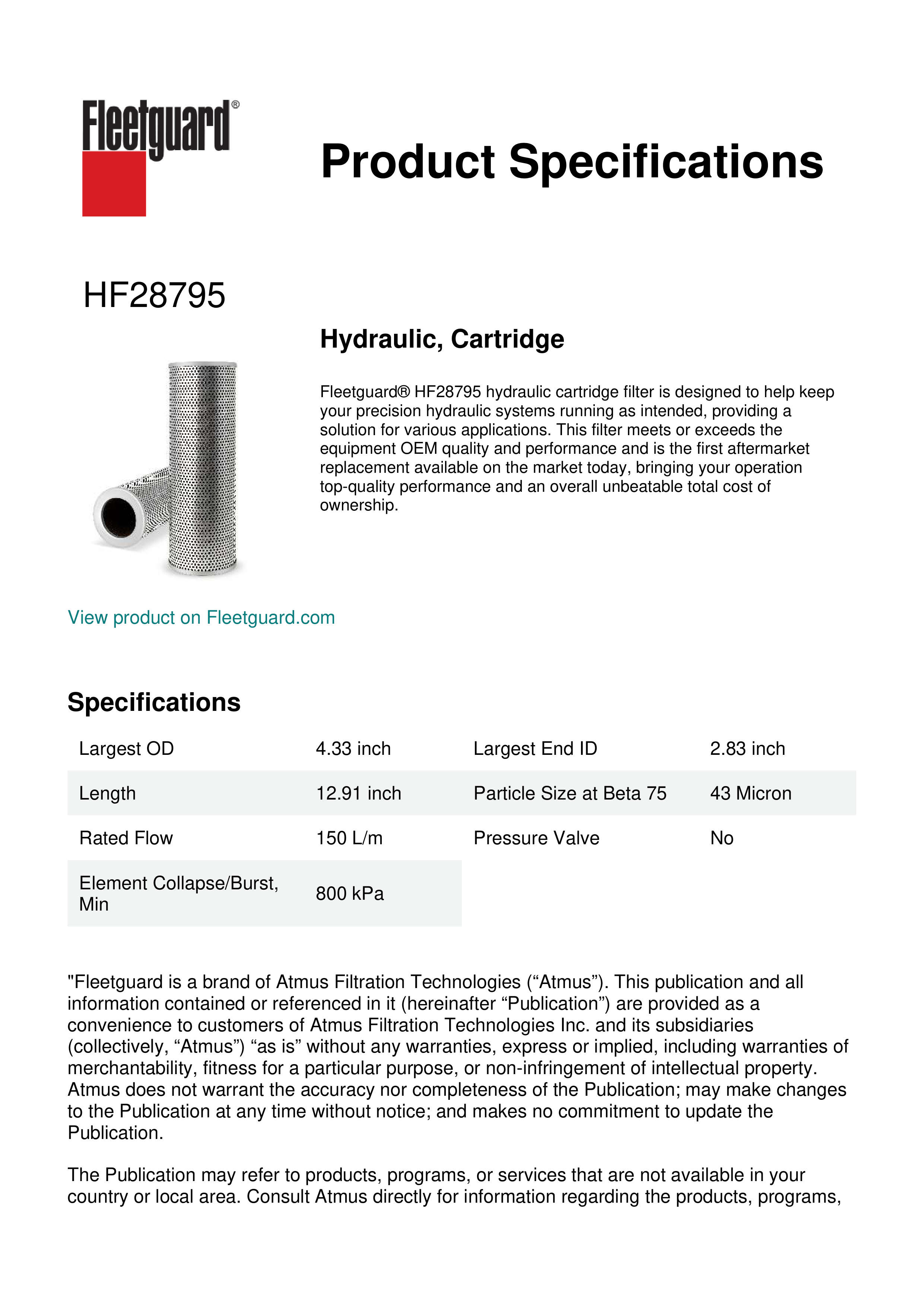 Fleetguard® HF28795 hydraulic cartridge filter is designed to help keep your precision hydraulic systems running as intended, providing a solution for various applications. This filter meets or exceeds the equipment OEM quality and performance and is the first aftermarket replacement available on the market today, bringing your operation top-quality performance and an overall unbeatable total cost of ownership.Specification