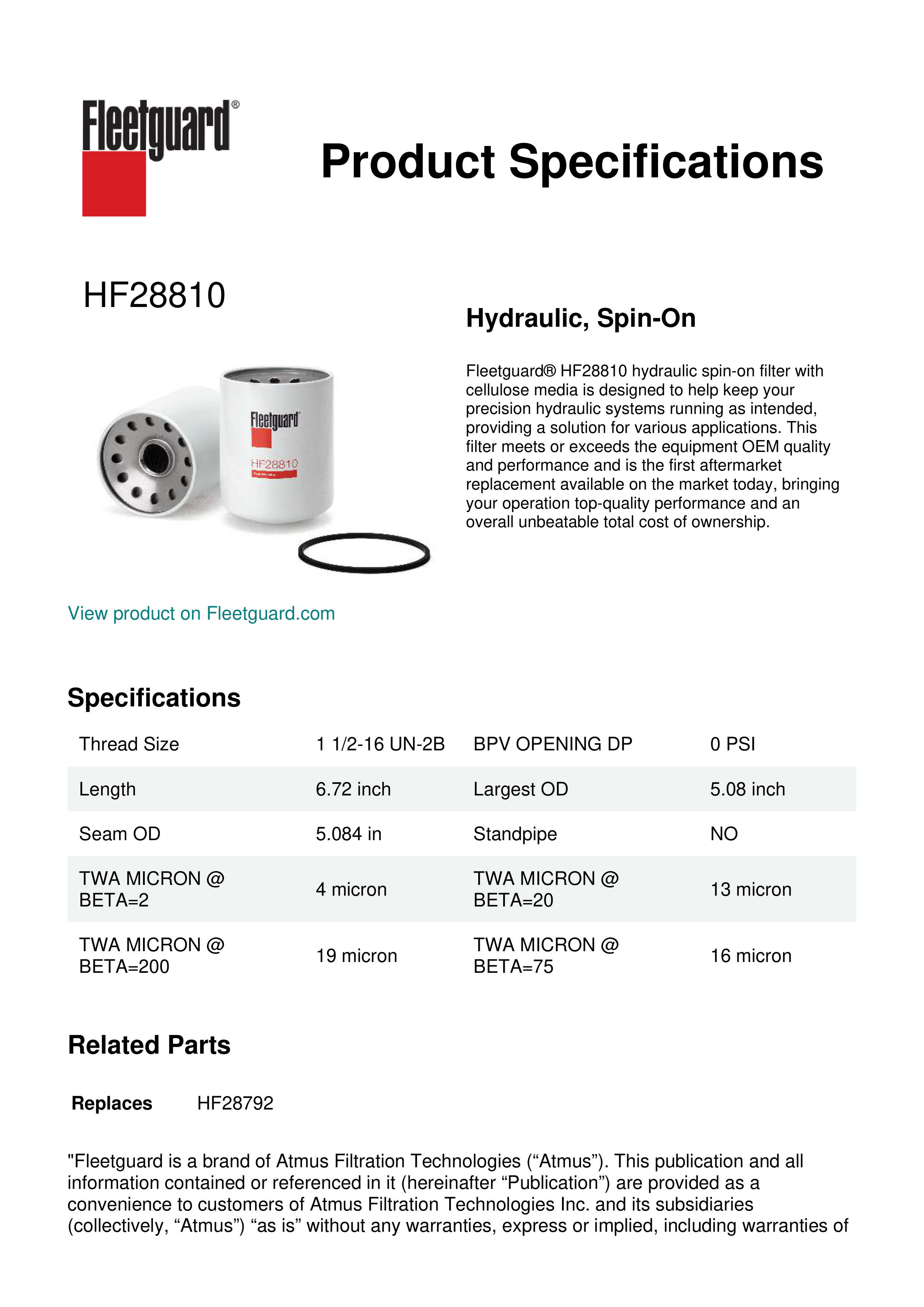 Fleetguard® HF28810 hydraulic spin-on filter with cellulose media is designed to help keep your precision hydraulic systems running as intended, providing a solution for various applications. This filter meets or exceeds the equipment OEM quality and performance and is the first aftermarket replacement available on the market today, bringing your operation top-quality performance and an overall unbeatable total cost of ownership.Specification